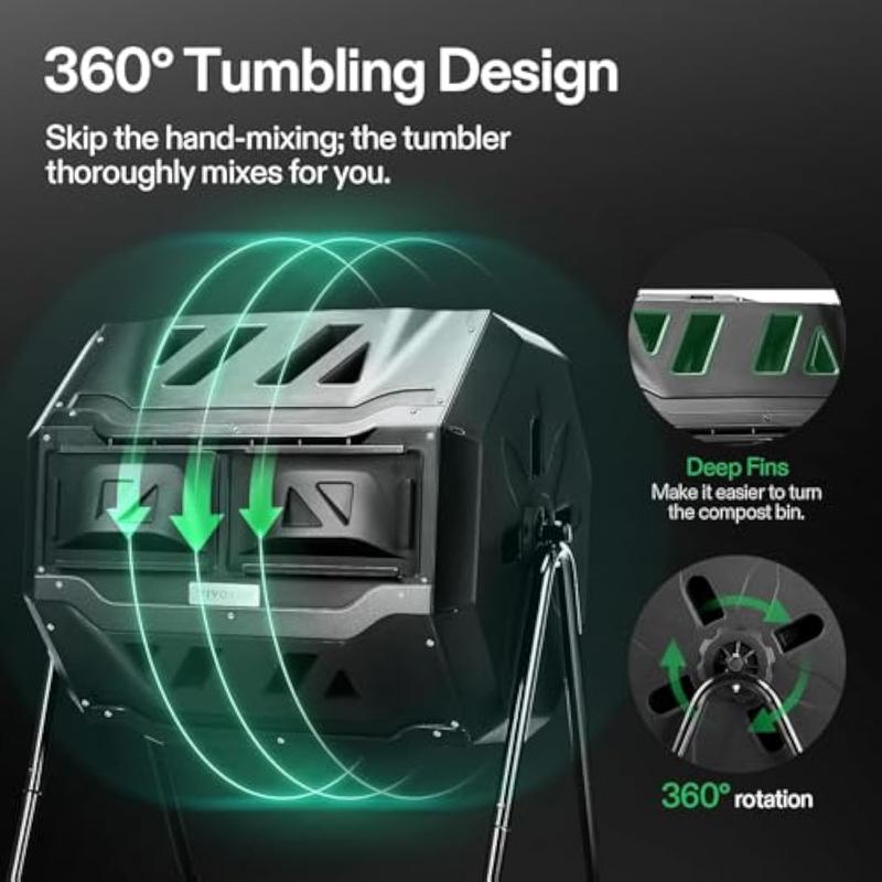 ·360⁰ Tumbling Design: The rotating design prevents you from digging or mixing the pile by hand; And the deep fins on eight panels make it easier to turn the compost bin