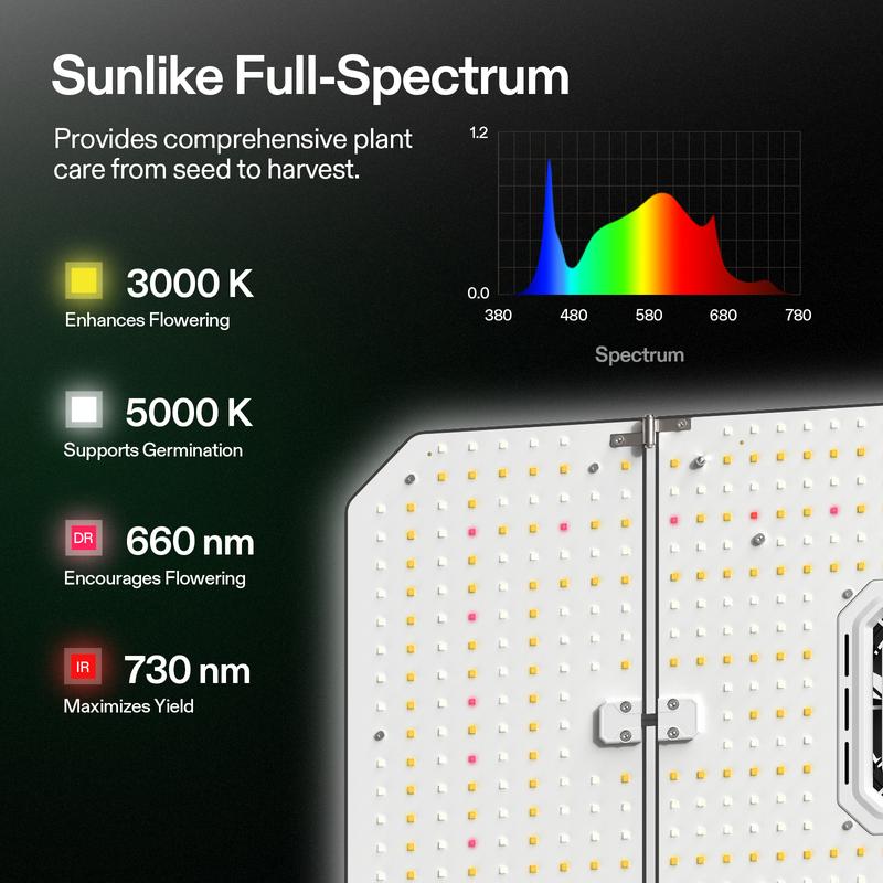 ·Full-spectrum Sunlike Lighting: These LEDs deliver optimal light-spectrum coverage (380nm-780nm, 660nm, 3000K, 5000K) and produce maximum PAR output at various distances; The lights can get through the surface of plants and deep into them to increase yields
