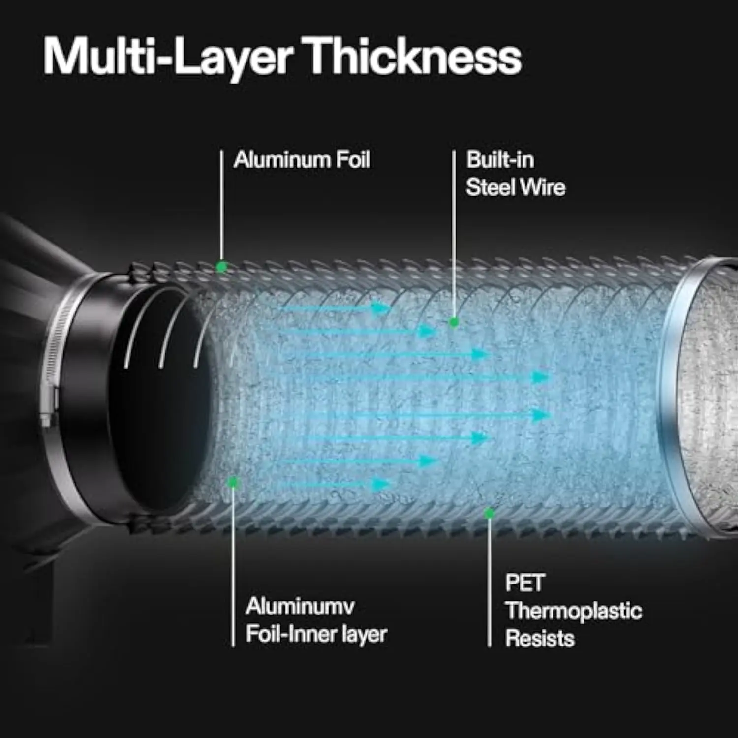 ·Multi-Layer Structure: Reinforced multi-layer design with built-in steel wire for enhanced durability and leak resistance; The internal aluminum foil layer provides fire/flame retardancy; PVC outer layer offers flexibility and corrosion resistance; The thermoplastic PET middle layer prevents cuts/tears and leakage