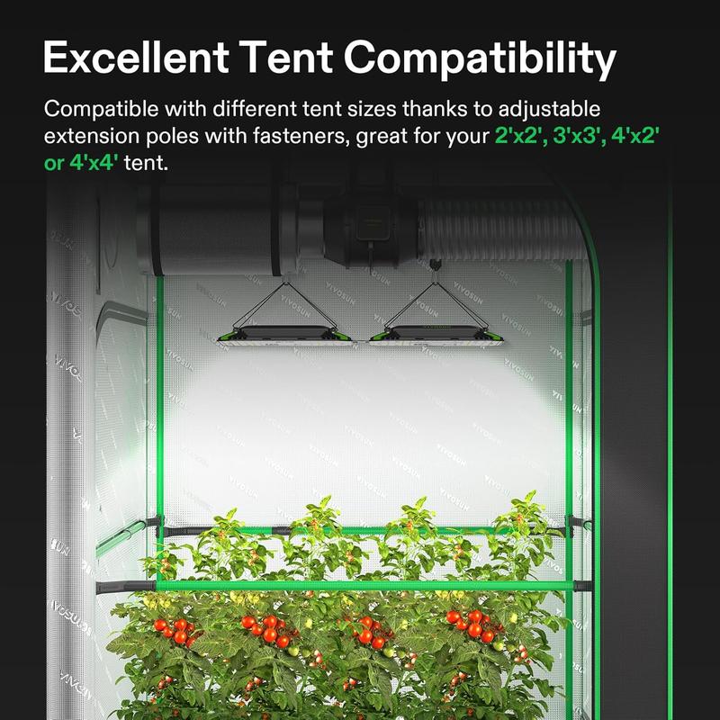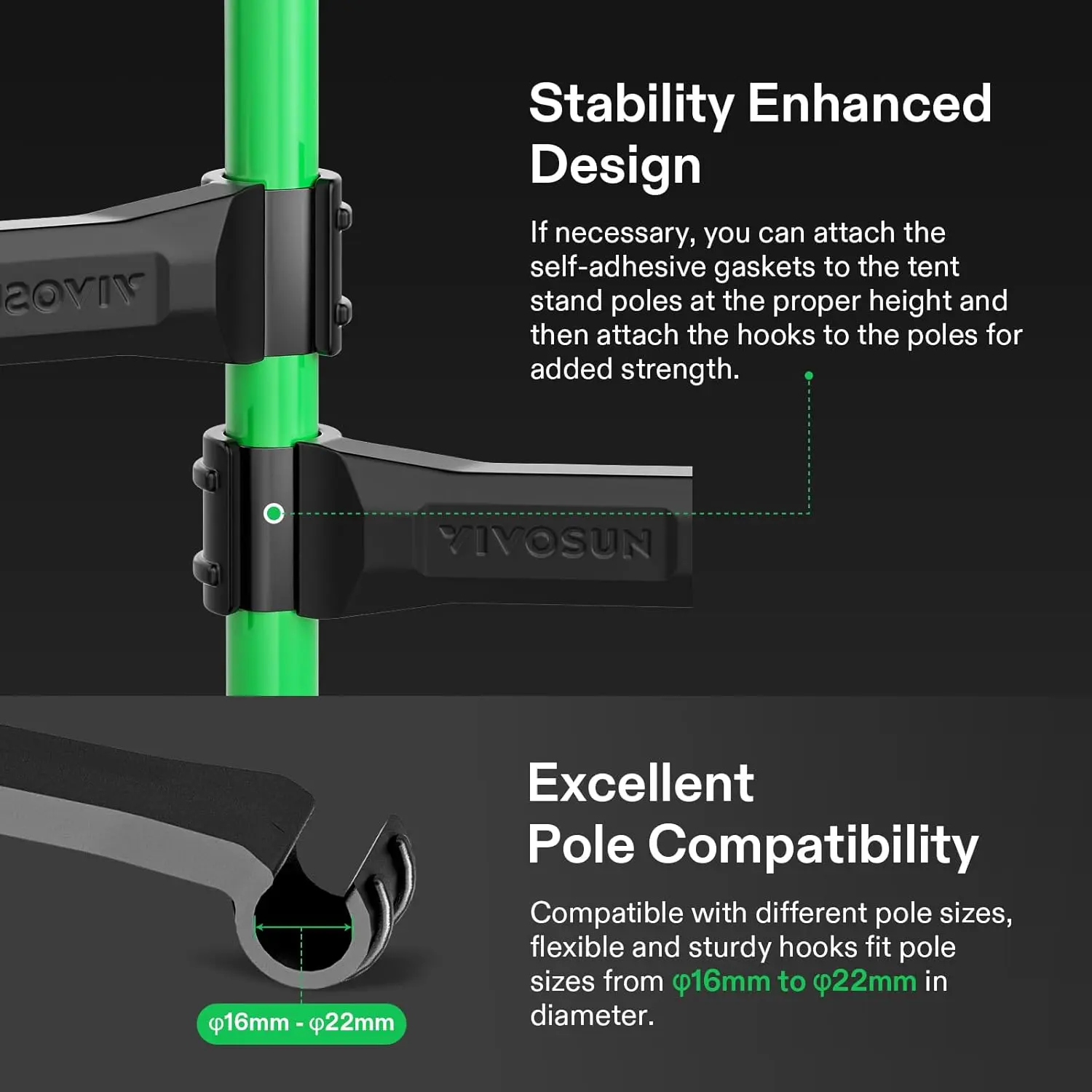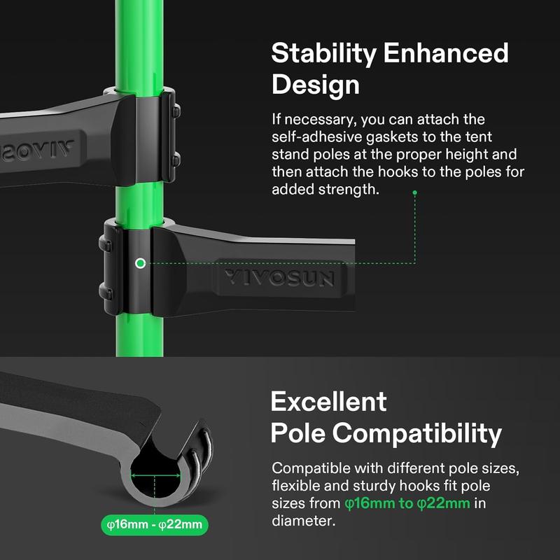 Compatible with different pole sizes, flexible and sturdy hooks fit pole sizes from 16mm to 22mm in diameter; Compatible with different tent sizes thanks to adjustable extension poles with fasteners, great for your 2'x2', 3'x3', 4'x2' or 4'x4' tent