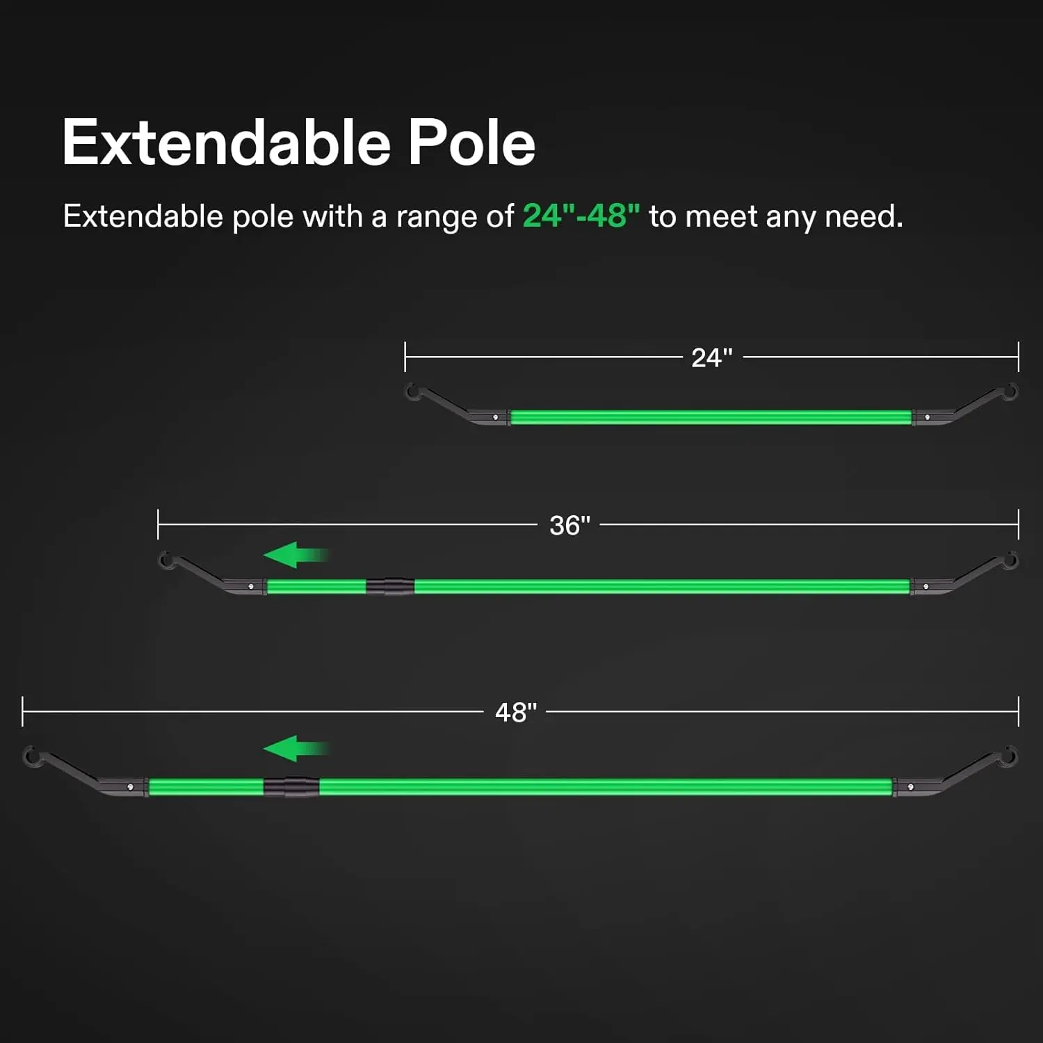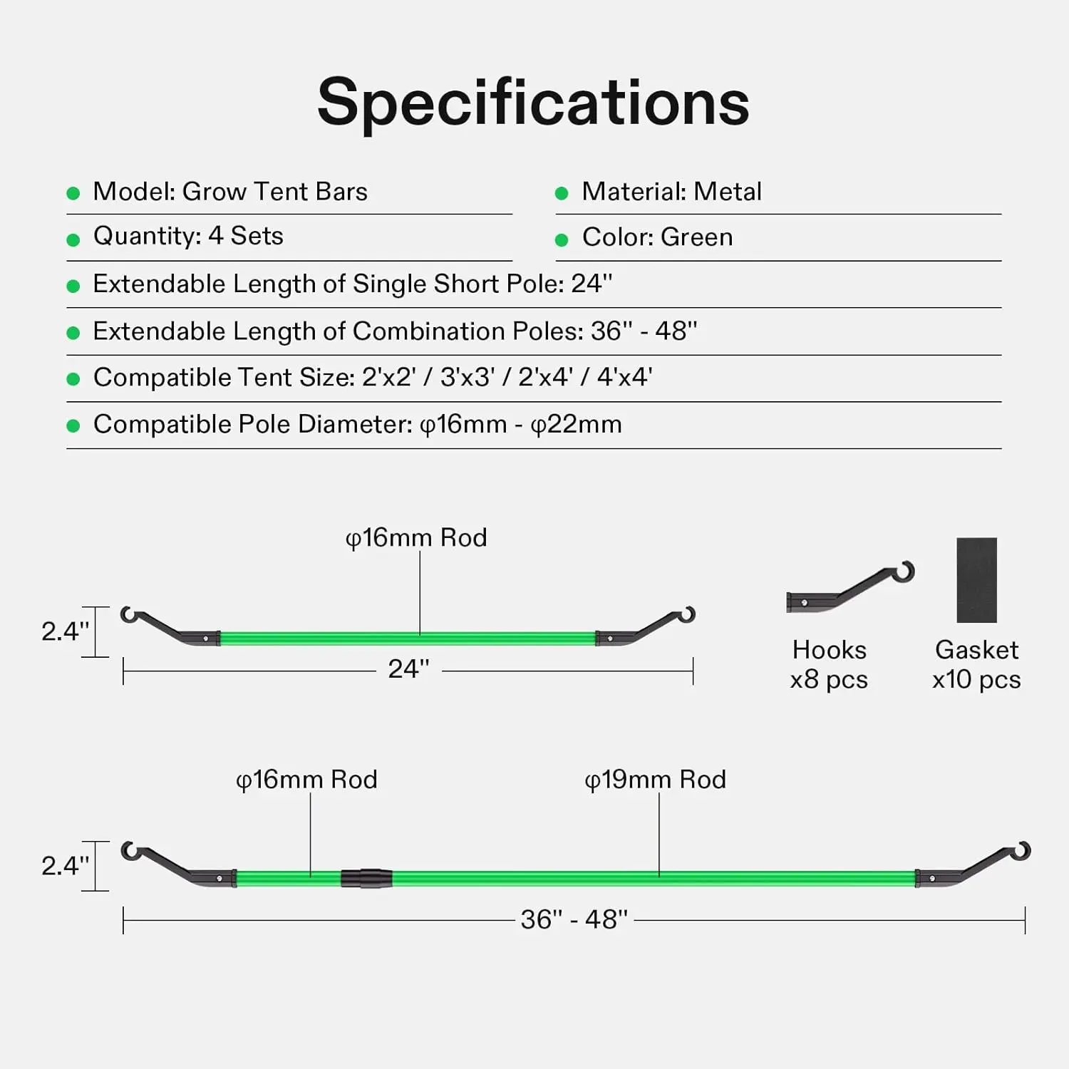 Extendable pole with a range of 24"-48" to meet any need; The set includes 4 green support rods with a material thickness of 0.4mm; 4 lengths of 24.8” of 19mm diameter metal pipe, 4 lengths of 15.7” of 16mm diameter metal pipe