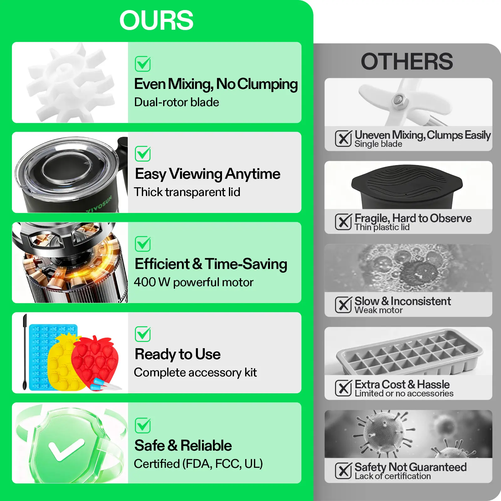 Built with an SS304 stainless steel inner pot, food-grade silicone rotor, and BPA-free housing and handle. The thickened transparent PC lid is heat-resistant and shatter-proof, allowing you to safely watch the process from start to finish.