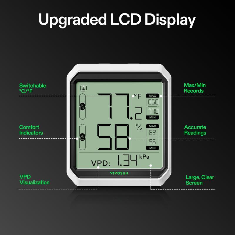 ·User-Friendly Design: Easy to use with a big, clear LCD screen, visualized VPD design, highest and lowest temp & humidity records, and indicators for three comfort ranges for temp and humidity; Multiple installation methods are available - wall mounting, kick-standing, and hanging