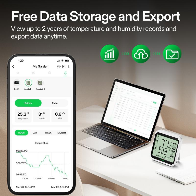 ·2-Year Free Data Storage: This indoor temp & humidity gauge offers a 2-year free data storage service, allowing you to analyze the historical temp & humidity data and make adjustments accordingly; You can also easily export the data at any time