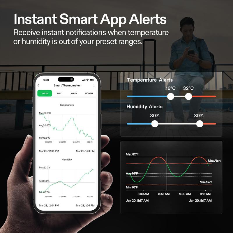 ·High Accuracy & Dual Channels: Utilizing a built-in smart Swiss sensor, coupled with the option to incorporate an external sensor probe for dual-channel monitoring, this wireless thermometer hygrometer delivers rapid, real-time, and highly accurate temp & humidity readings (±0.9℉/±5%RH)