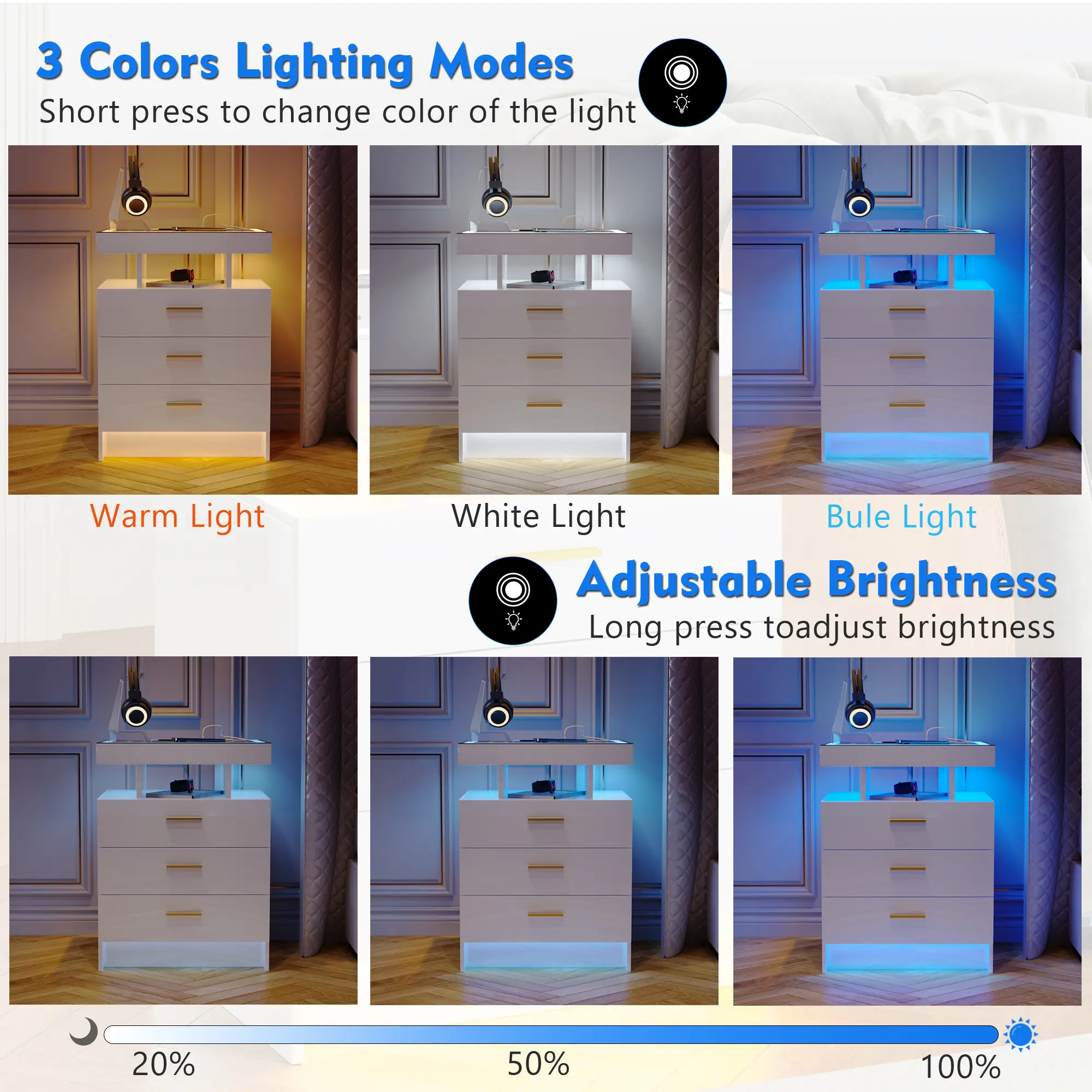 ·【Auto Sensor 3 Color Light Dimmable】- You can switch 3 dimmable colors (white/cool blue/warm yellow) of this LED Nightstand according to your needs and preferences. This beautiful nightstand with LED lights will illuminate your home and look warmer.