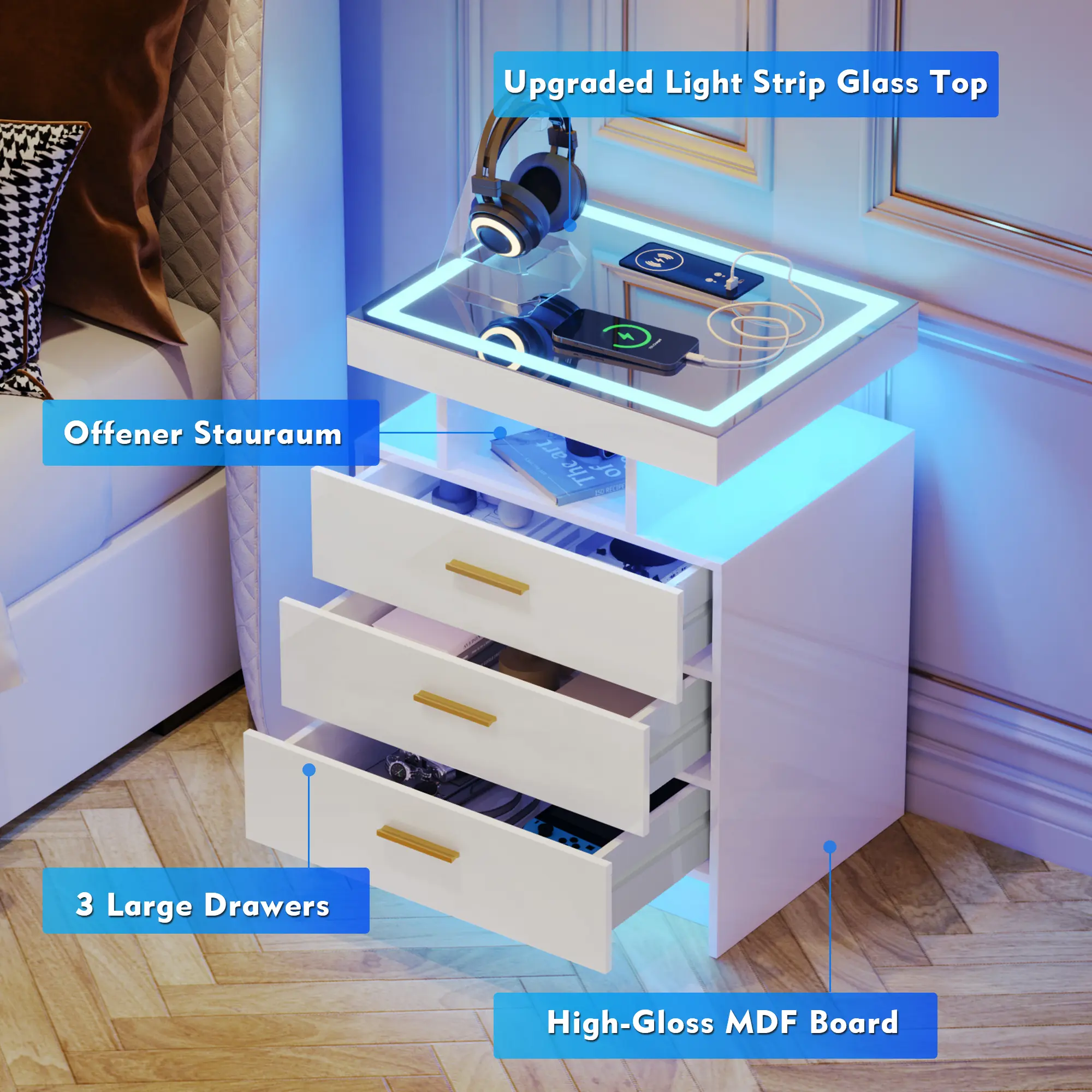 FeatureLED lighting,Multiple drawers,USB type-c charging port