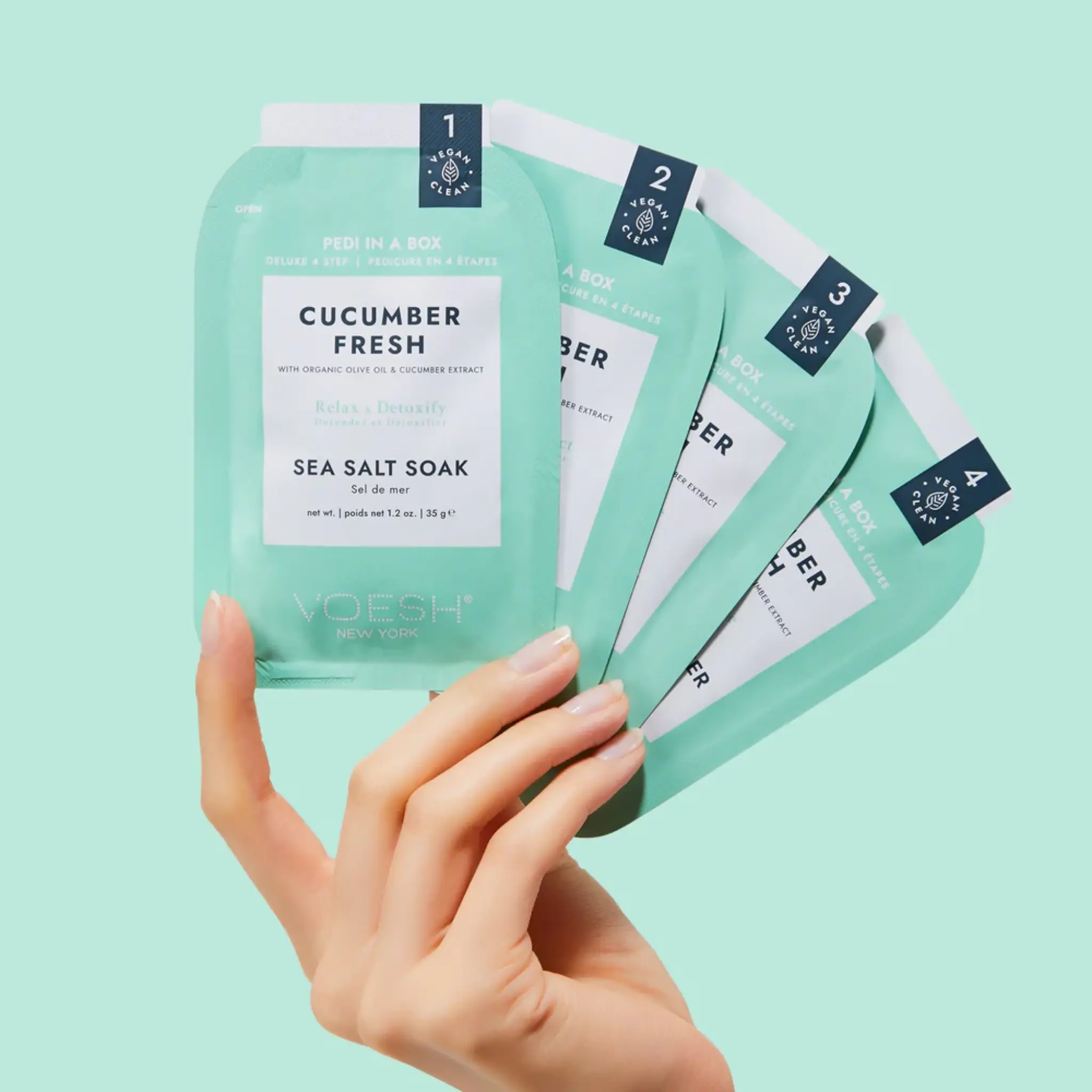 Indulge in a spa-worthy pedicure experience with the Voesh 4-in-1 PediBox Variety Bundle. Featuring five refreshing scents—Cucumber Fresh, Ocean Refresh, Lemon Quench, Mango Delight, and Pumpkin Pie—each box includes everything you need for a complete pedi: Sea Salt Soak, Sugar Scrub, Mud Masque, and Massage Butter.