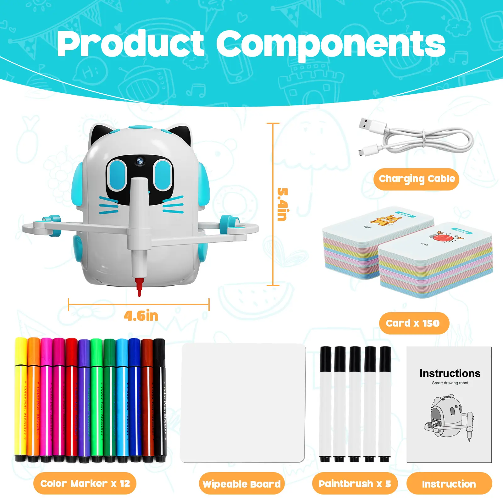 The package includes everything to get started: 1 drawing robot, 150 drawing cards, 12 color markers, 5 pens, a reusable drawing board, and a Type-C charging cable.