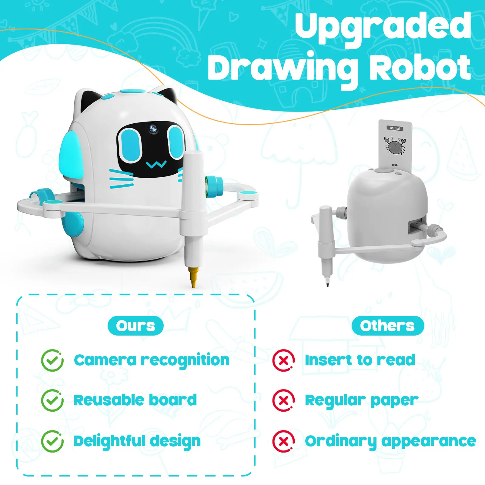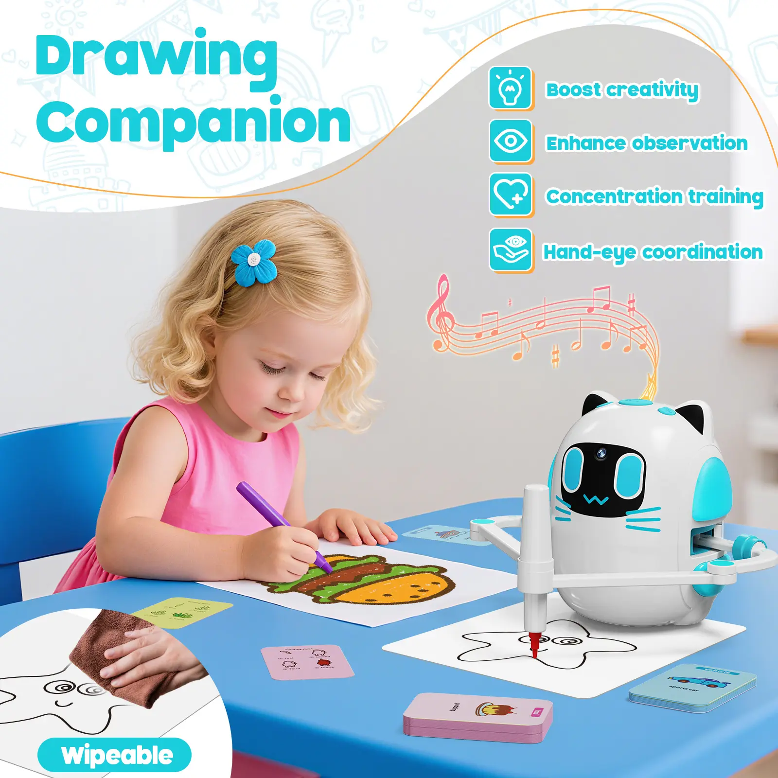 More than just a tool, the robot acts like a little drawing partner. With playful built-in music, it keeps kids entertained and motivated as they follow step-by-step guides. Each drawing session promotes creativity, hand-eye coordination, focus, and imagination.