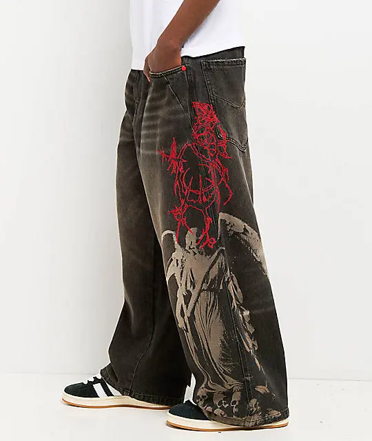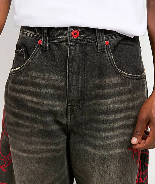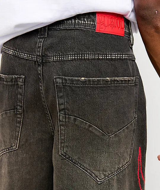 The Void Angel ultra wide leg black wash jeans from Vitriol bring a chaotic, cyber aesthetic. Red embroidered sigils run down both legs, while a grey Angel and skulls are screen-printed near the bottom of the left leg. The oversized fit seals the underground vibe of these skater pants.