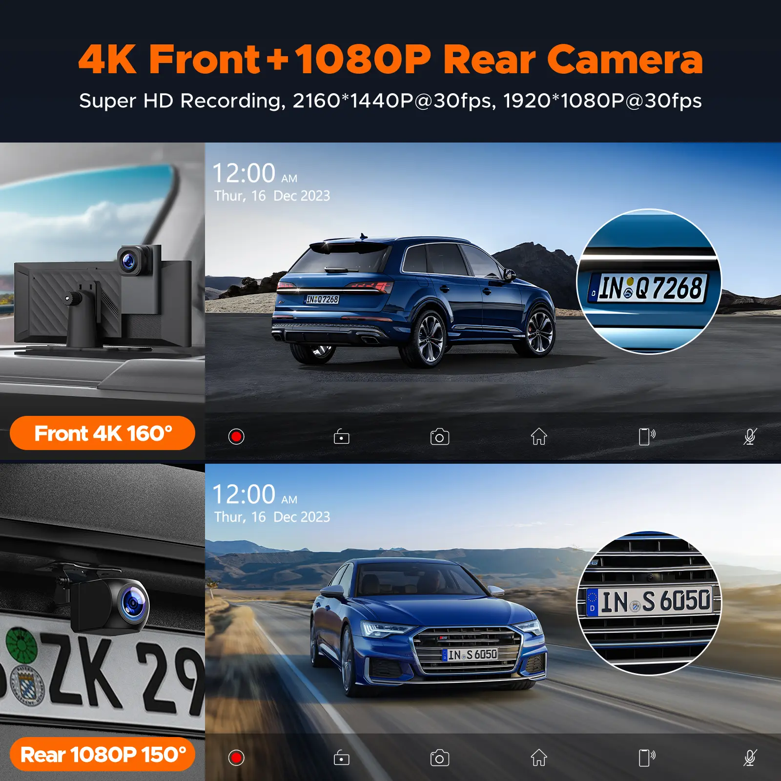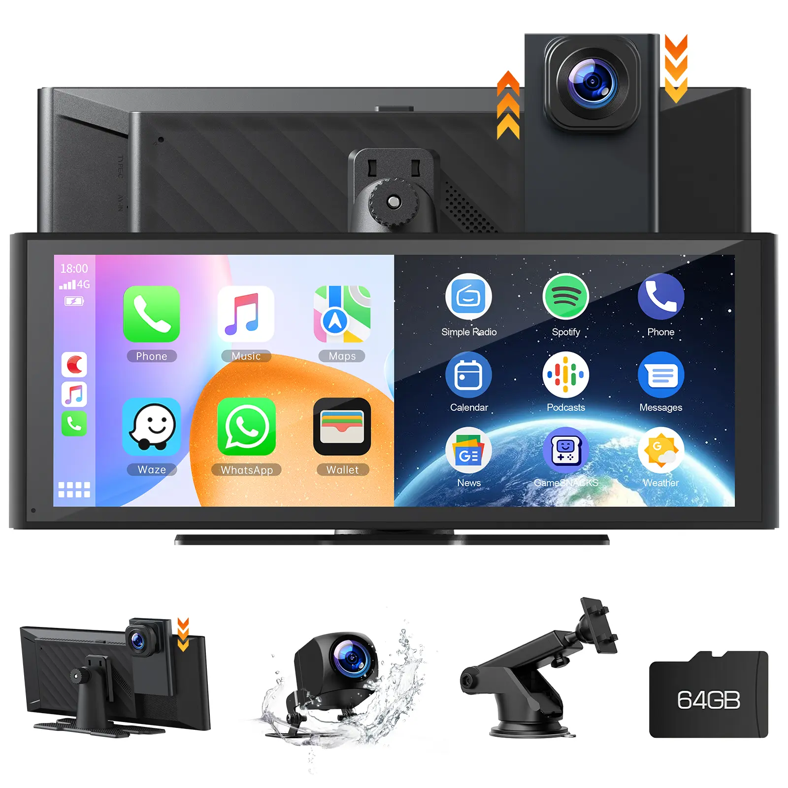 【The Carplay Screen with Ultra FHD 4K+1080p Dash Cam Front and Rear】Featuring top quality 4K front and 1080p rear dash camera, and features HD night vision to capture more detailed images, including street signs and license plates, even at night. Additionally, with a wide-angle camera, the dash camera has extended views and fewer blind spots. At the same time, the rear dash camera also has a reversing assist function. When you reverse, the car screen will display the reversing assist line.