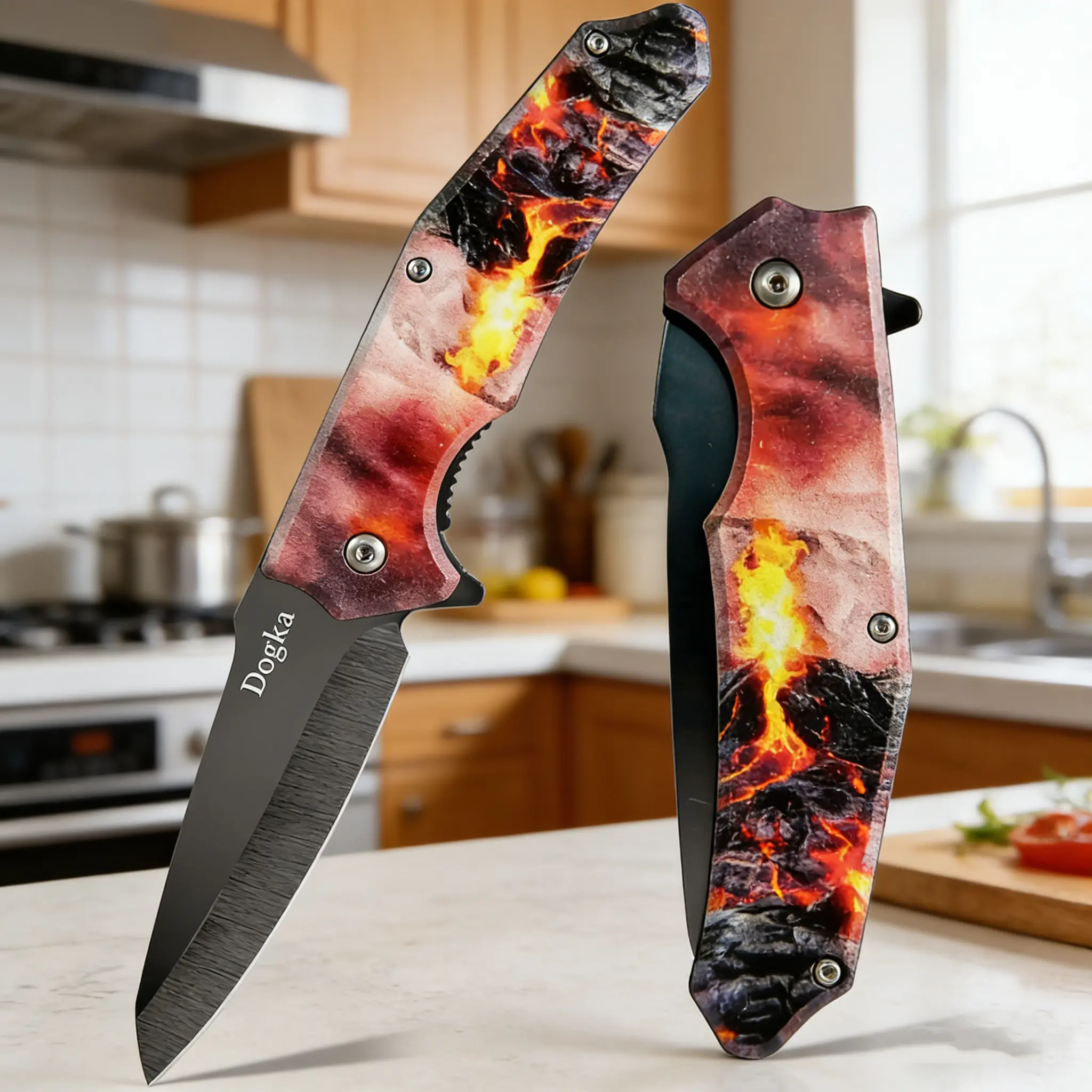 Elevate your kitchen routine with this eye-catching folding kitchen knife, crafted for everyday food prep and fruit cutting. Featuring a vivid volcano lava pattern handle, it blends sharp functionality with bold, artistic style—perfect for adding a unique touch to your countertop or gifting to home cooks.