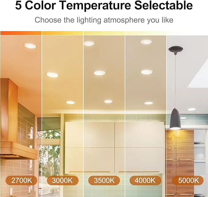 ·DAYBETTER 5CCT LED Recessed Ceiling Lights: Embrace versatility with our 5-color temperature selection (2700K/3000K/3500K/4000K/5000K), easily adjustable to suit your mood and eliminate the hassle of returns due to color mismatches. Our 6-inch lights offer a seamless blend of ambiance and technology.