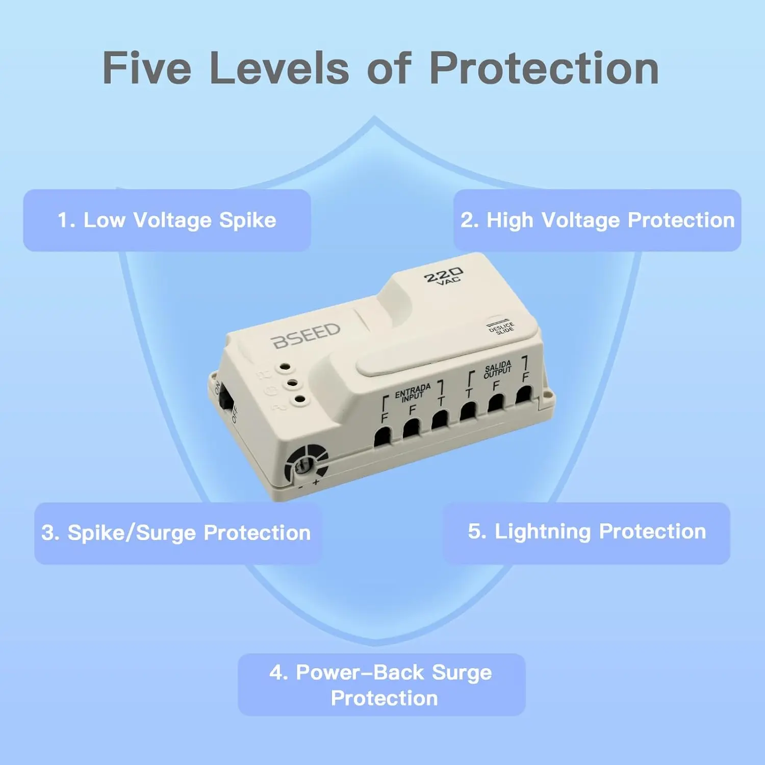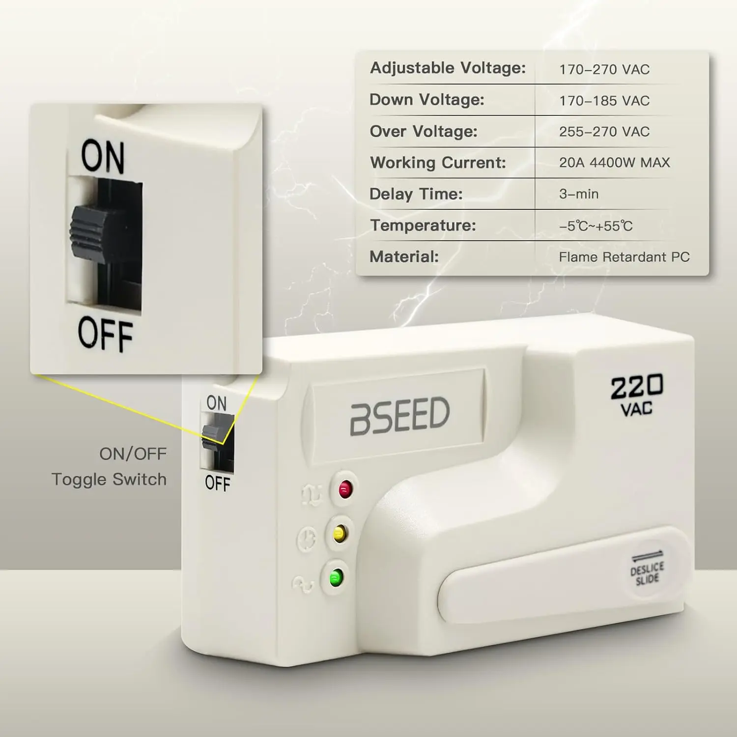 Automatic Induction Protection: Protect your electrical devices by interrupting the current flow from voltage spikes, instant surge, voltage fluctuation, brownout, and that voltage which are too high or too lowDelay Function: If the device encounters (electric power) voltage fluctuations, it will protect the appliance by providing the output until the voltage stabilizes.The "DELAY" indicator would be turned on to inform its user.The appliance would be delayed for 3 mins to confirm that the voltage is stable so that it could be re-establishedWorking Principle: As there is an interruption in the current flow, the Voltage surge protector gives an interval of 3 minutes to allow the voltage to stabilize.Additionally, the Voltage surge protector provides protection against voltage spikes that can damage electrical equipmentApplicable Equipment: The voltage surge protector suit for Air Conditioners, Freezers, Ice Makers, Washing Machines, or any Large AppliancesAdjustable Voltage: The minimum voltage capacity of the protector is adjustable.It can be adjusted according to your needs.Under Voltage:170V-185V(Adjustable) Over Voltage:255V-270V(Adjustable)