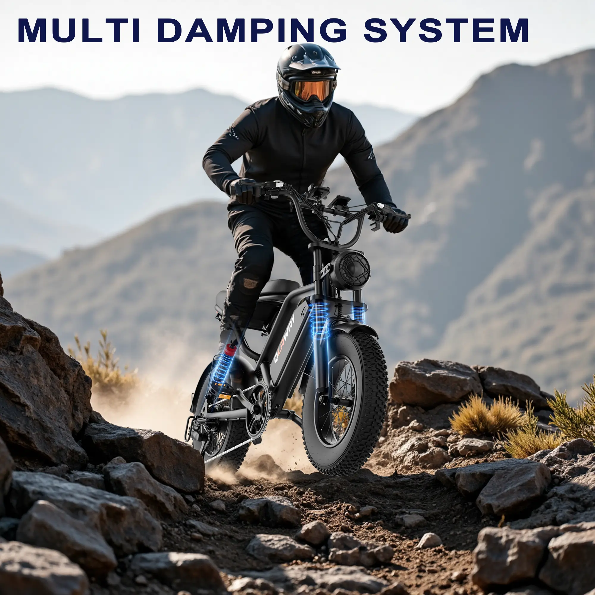 【FULL SUSPENSION】 – Front and rear quad-shock suspension ensures a comfortable ride on various terrains, including city streets, mountain trails, snow, and beach roads.