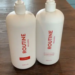 The Routine Wellness Volumizing Shampoo & Conditioner Set comes in two 14oz bottles and is manufactured in the USA. Enriched with organic coconut oil, argan oil, and tea tree leaf oil, it supports healthy-looking, manageable hair. Shelf life is two years.