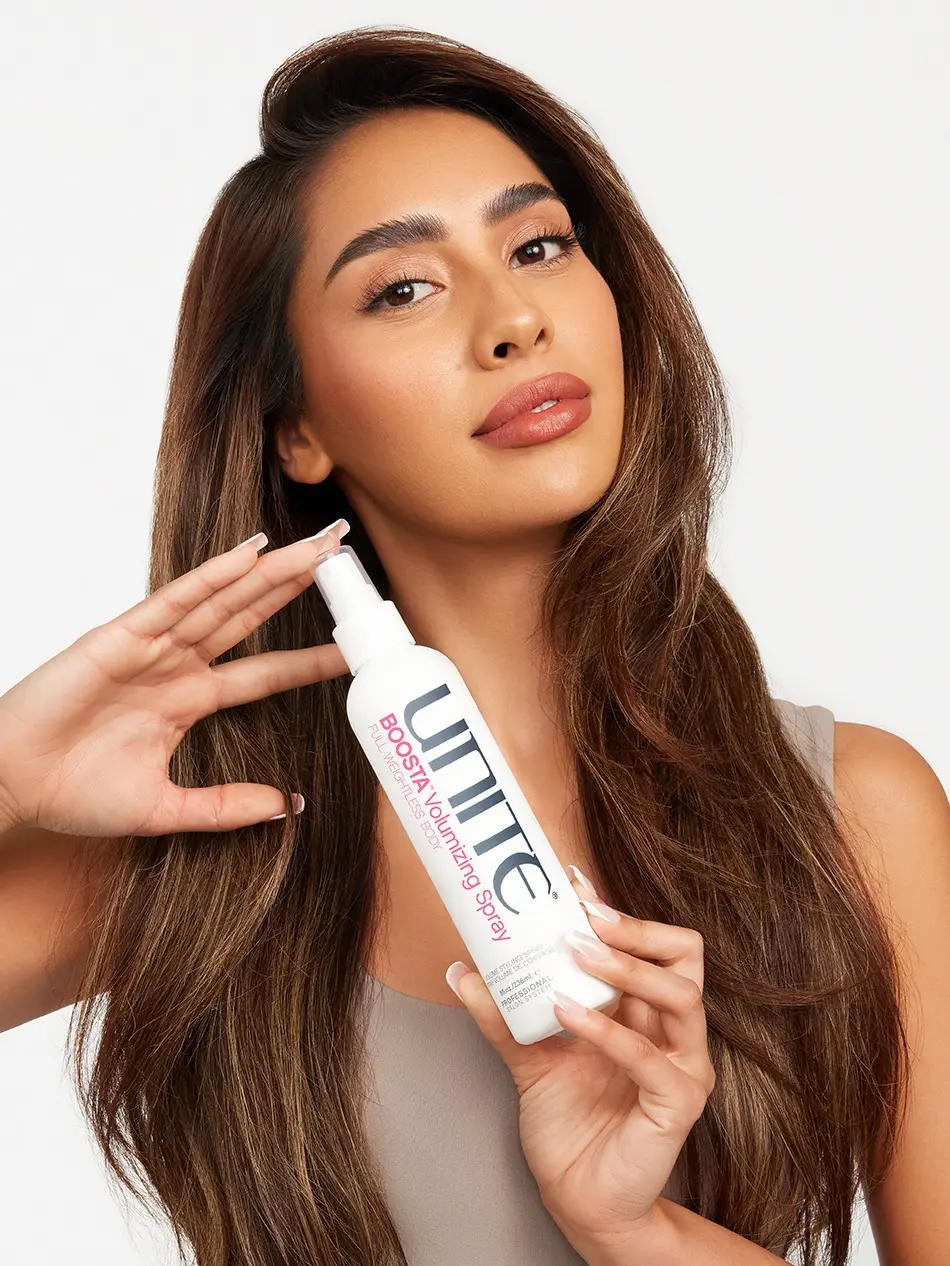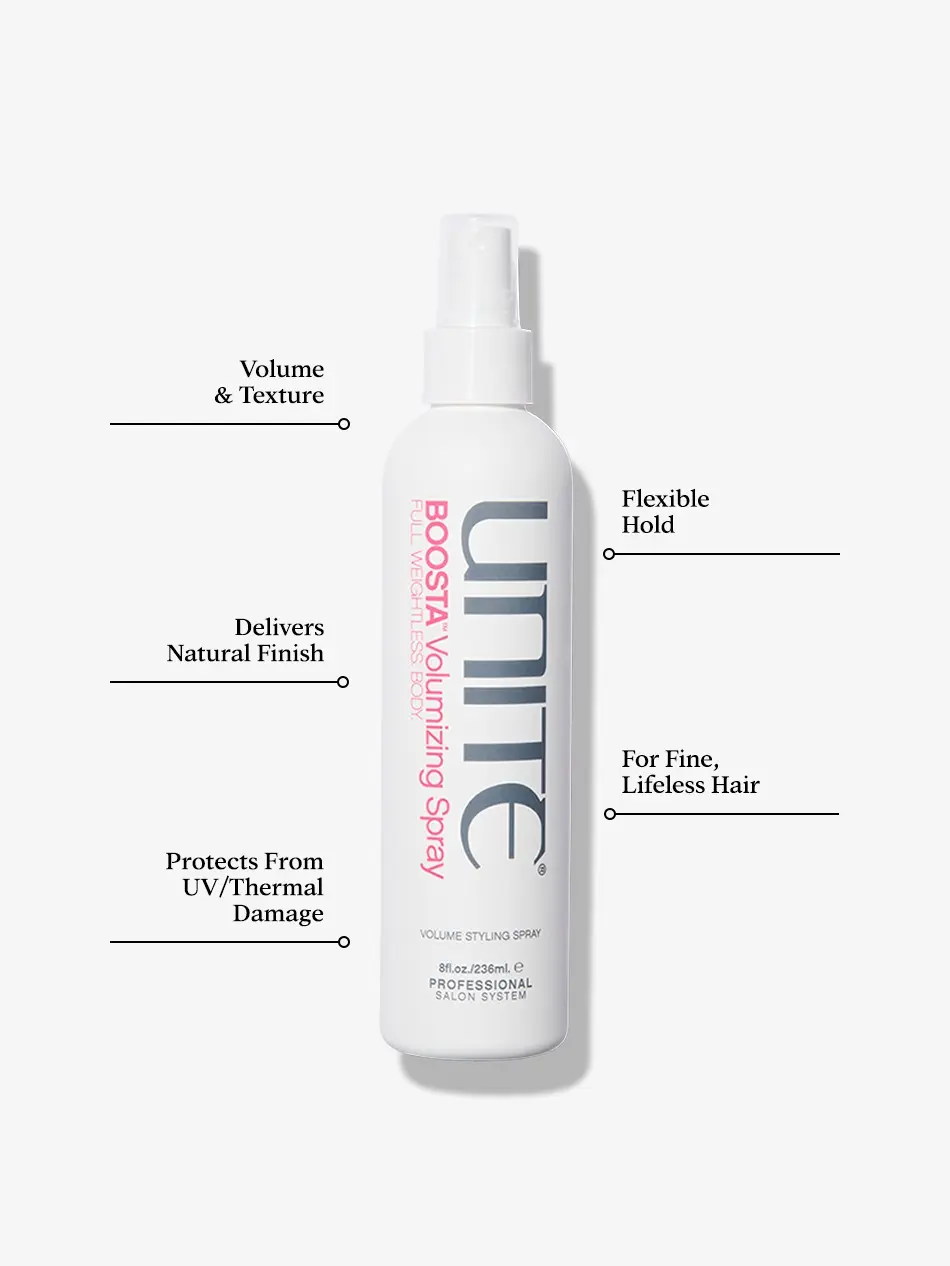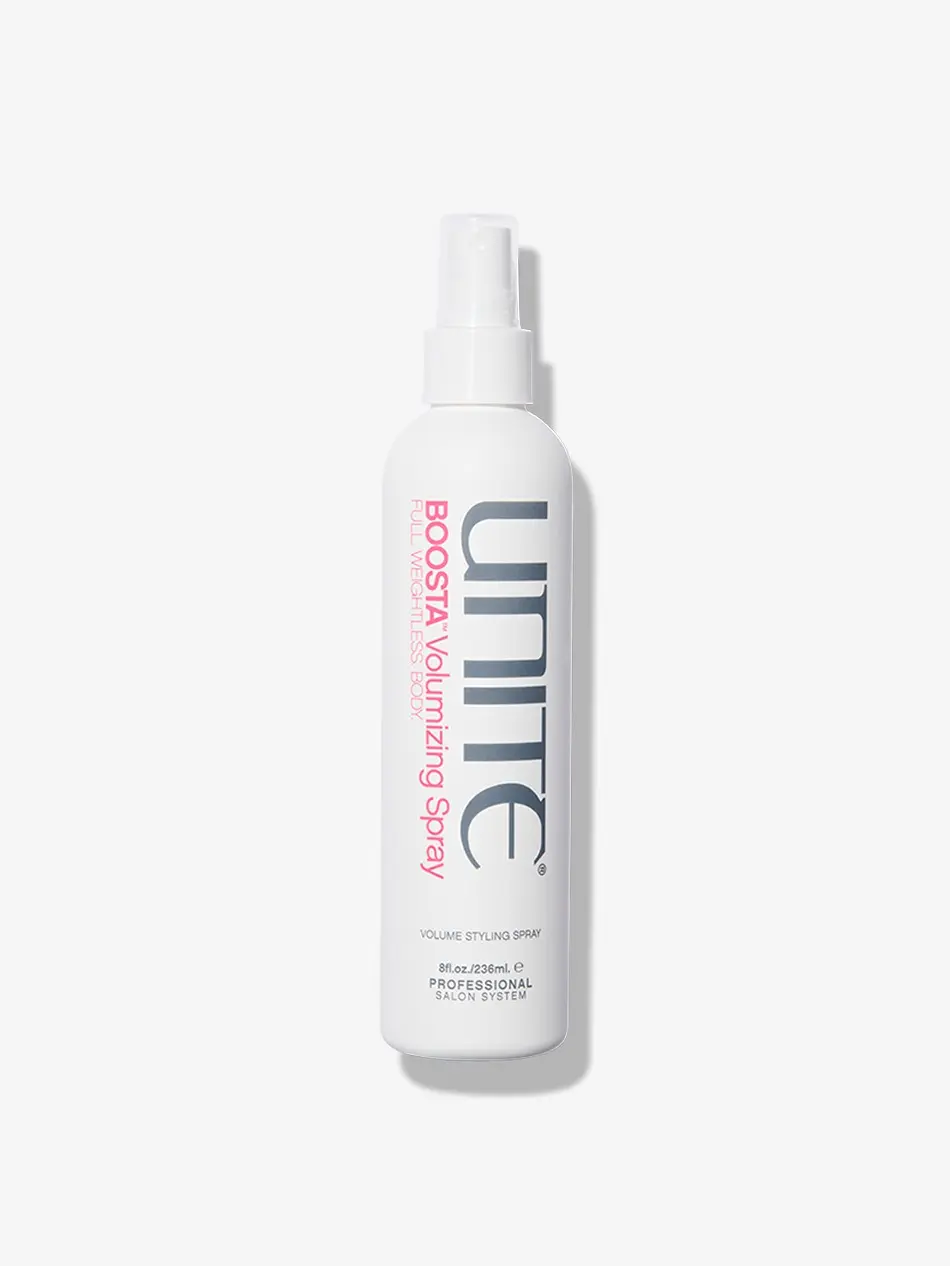 Cleanse and condition with BOOSTA Shampoo and Conditioner and towel dry. Spray volumizing spray thoroughly on damp hair and gently comb to distribute through to ends. Do not rinse. Follow with your favorite UNITE styling and finishing products. To increase volume, blow dry using a round brush at the roots.