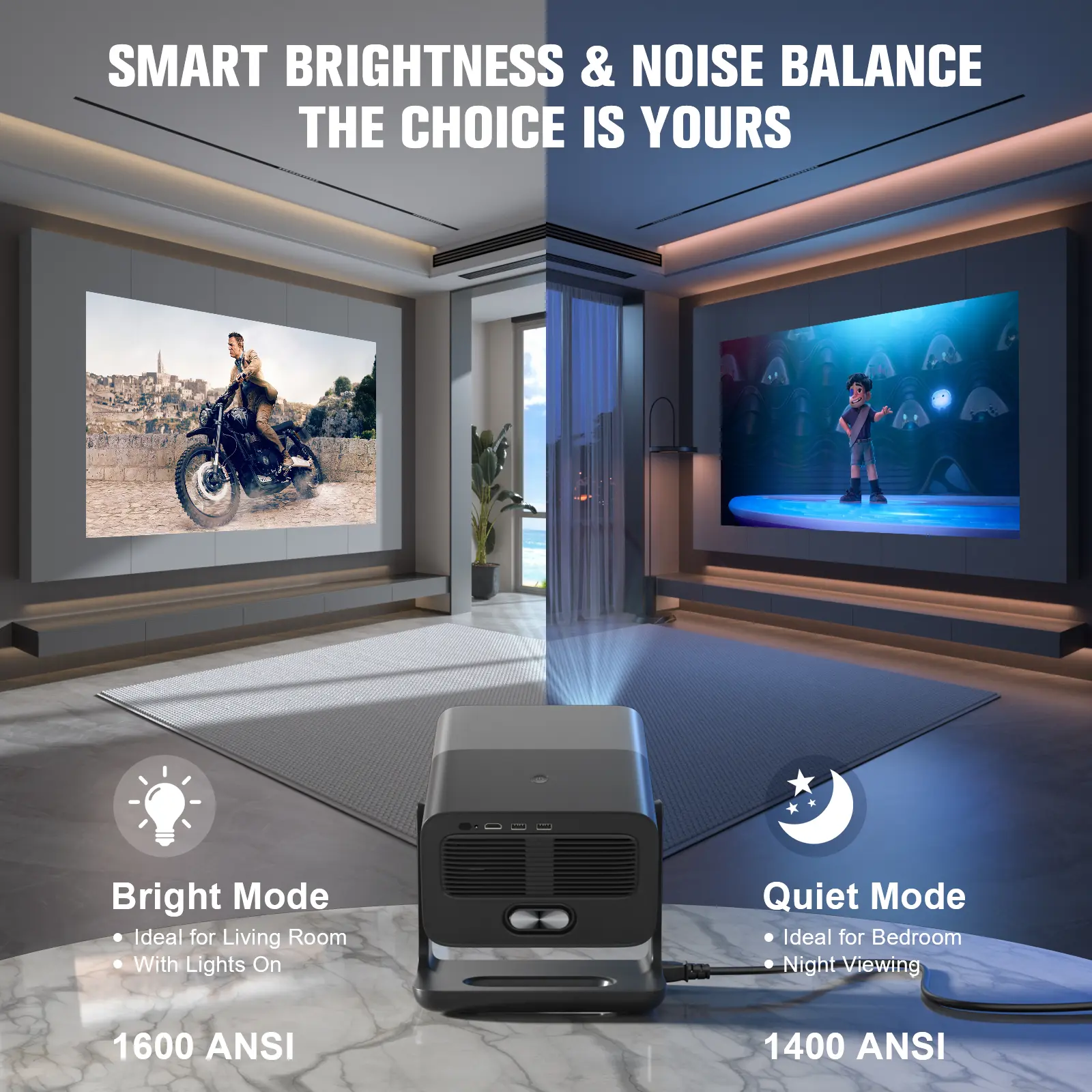 ·Standard Mode: 1400 ANSI – ultra-quiet, perfect for night viewing