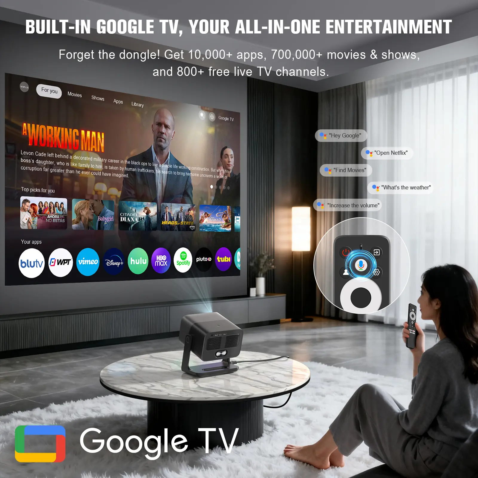 VOPLLS G7 projector features a built-in Google TV system with access to popular streaming apps like Netflix, Disney+, Prime Video, Hulu, and thousands more via Google Play.