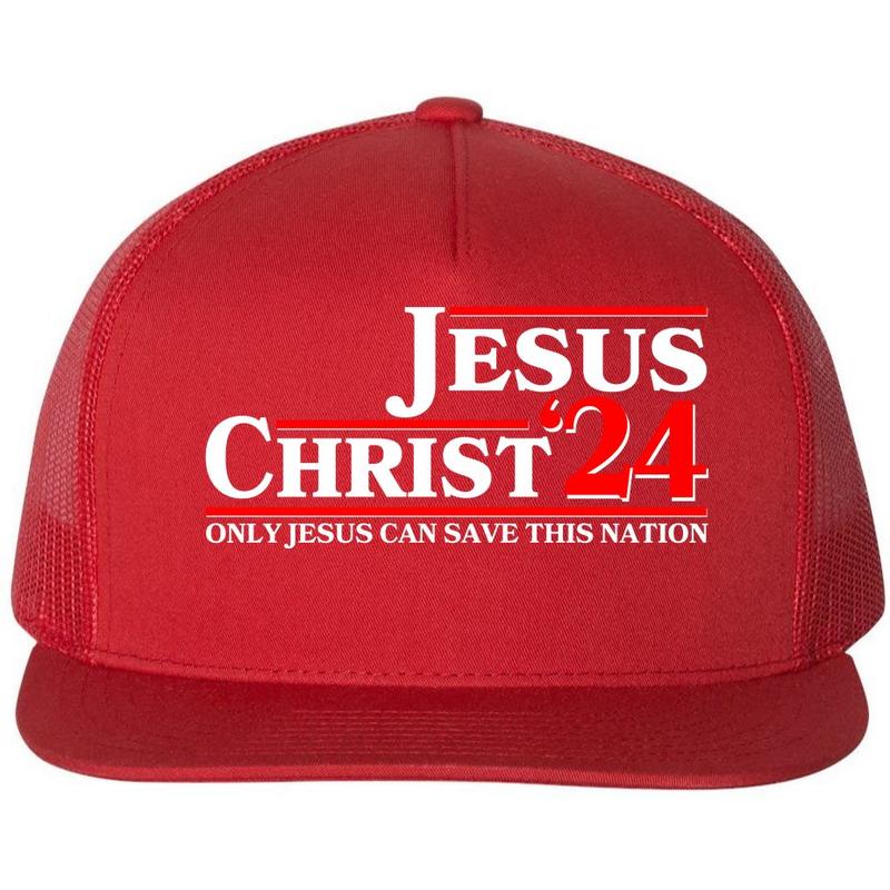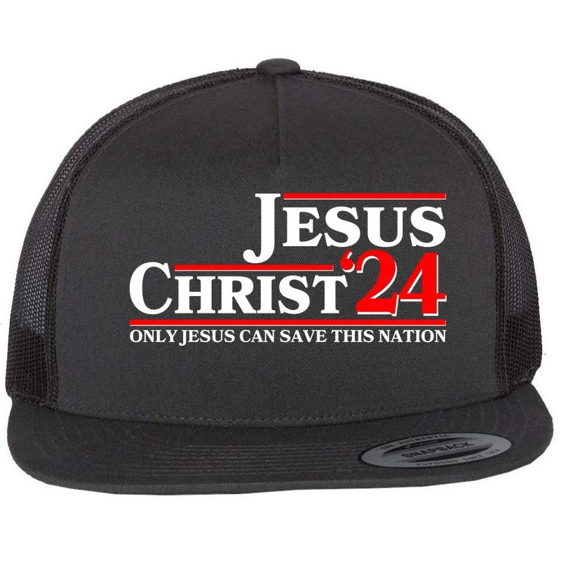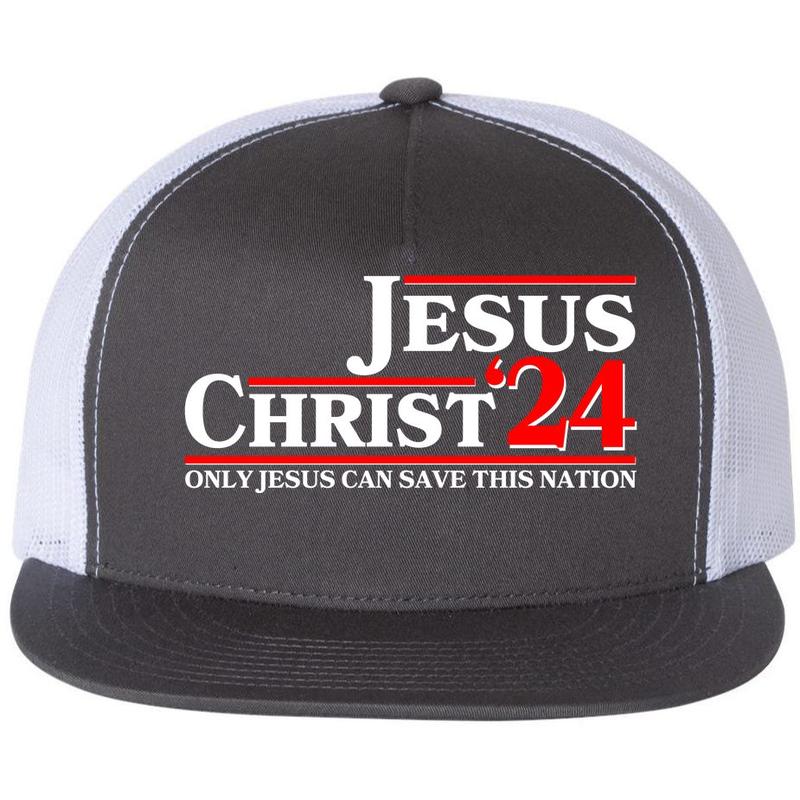 This Vote Jesus Christ 2024 Flat Bill Trucker Hat is a perfect accessory for expressing your faith and patriotism during the USA Presidential Election.