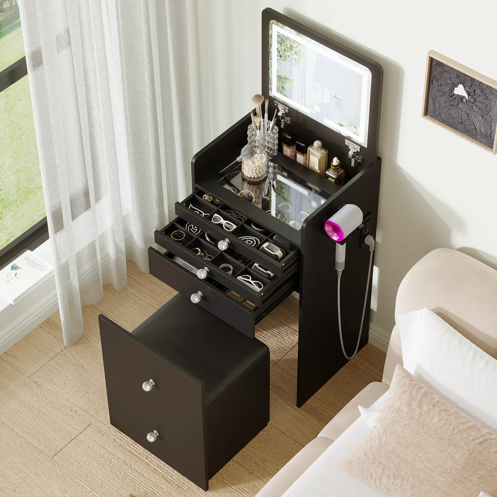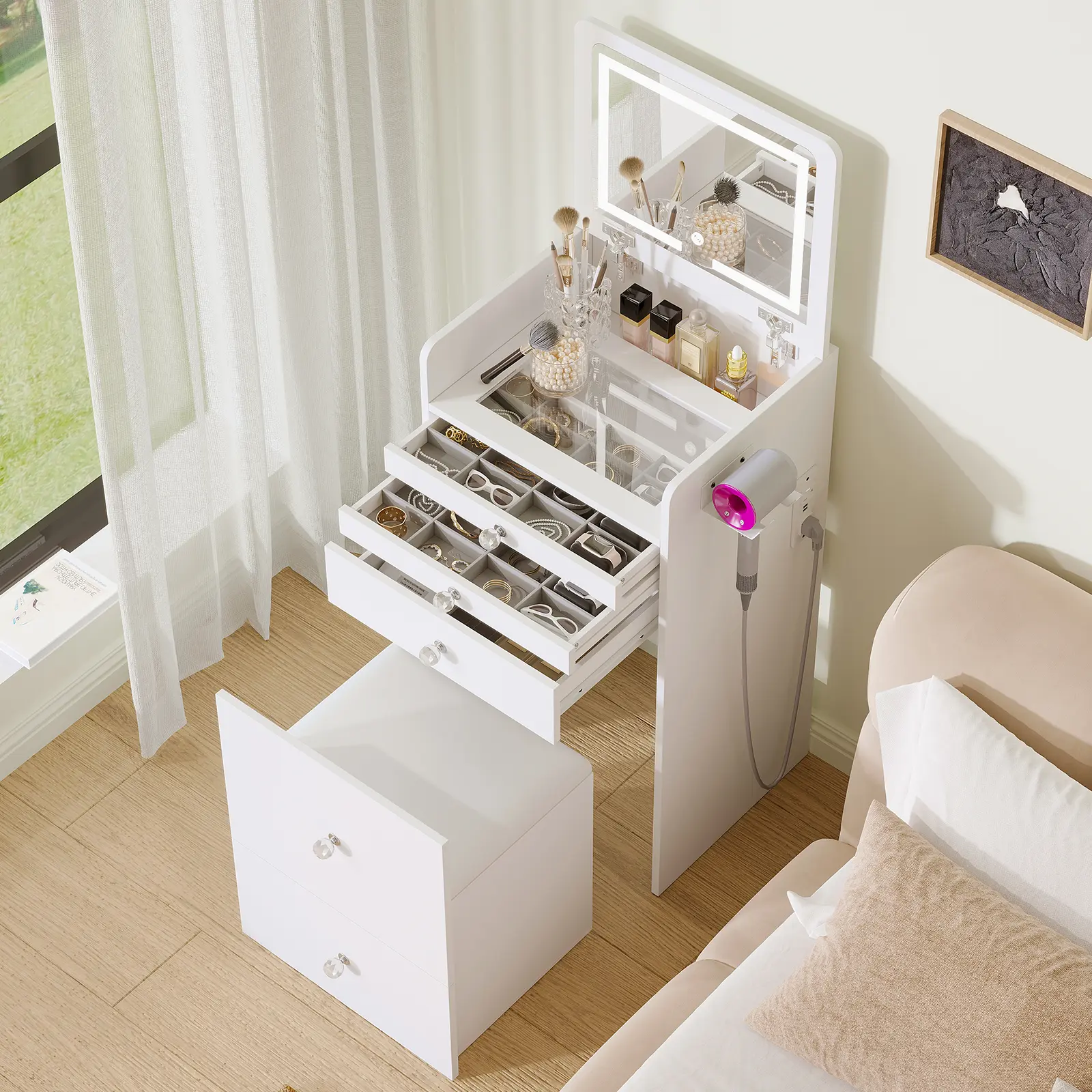 ·【Ample Storage Space】 This compact vanity features three drawers (a visible top drawer and a hidden storage stool), with additional hidden storage space beneath the mirror and stool. This unique design provides extra room for storing cosmetics, skincare products, and more.