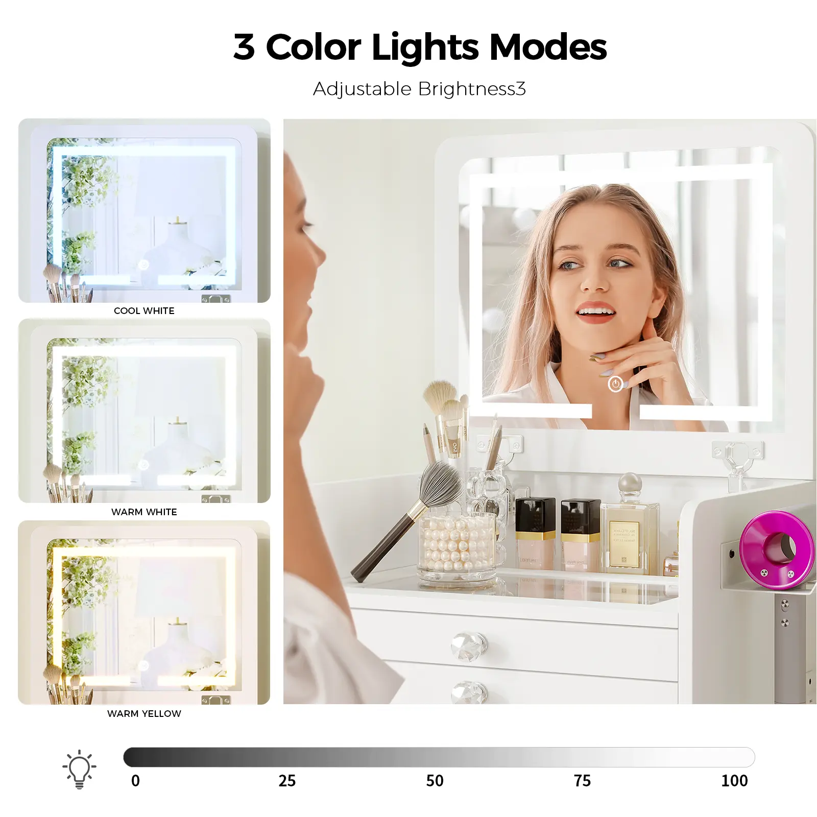 ·【Adjustable Brightness Makeup Mirror】 The mirror on the makeup desk offers 3 different color settings to adapt to various uses and scenarios. You can easily operate the switch by tapping the LED sensor button.