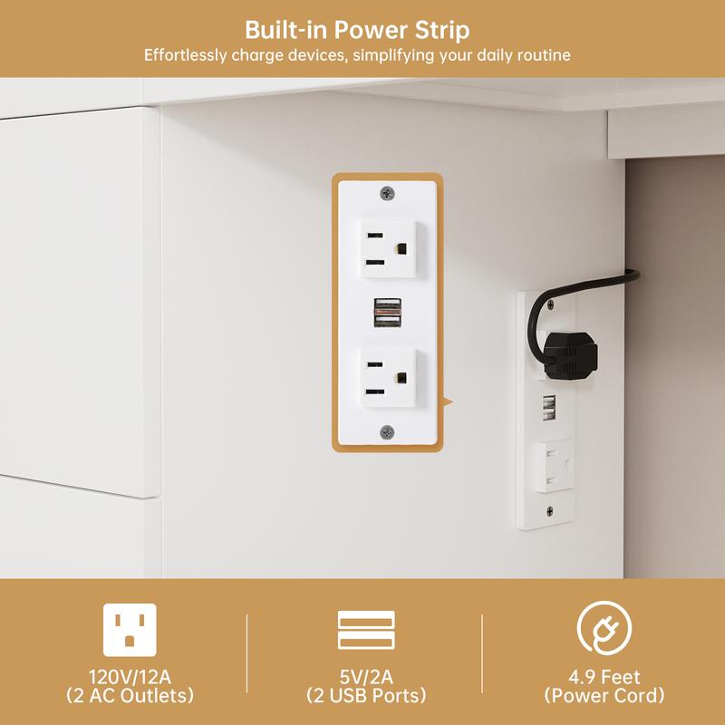 ◆Convenient Charging Station: Equipped with 2 standard plug sockets and 2 USB ports, this makeup desk allows for easy charging of hair dryers, curling irons, beauty devices, and phones.