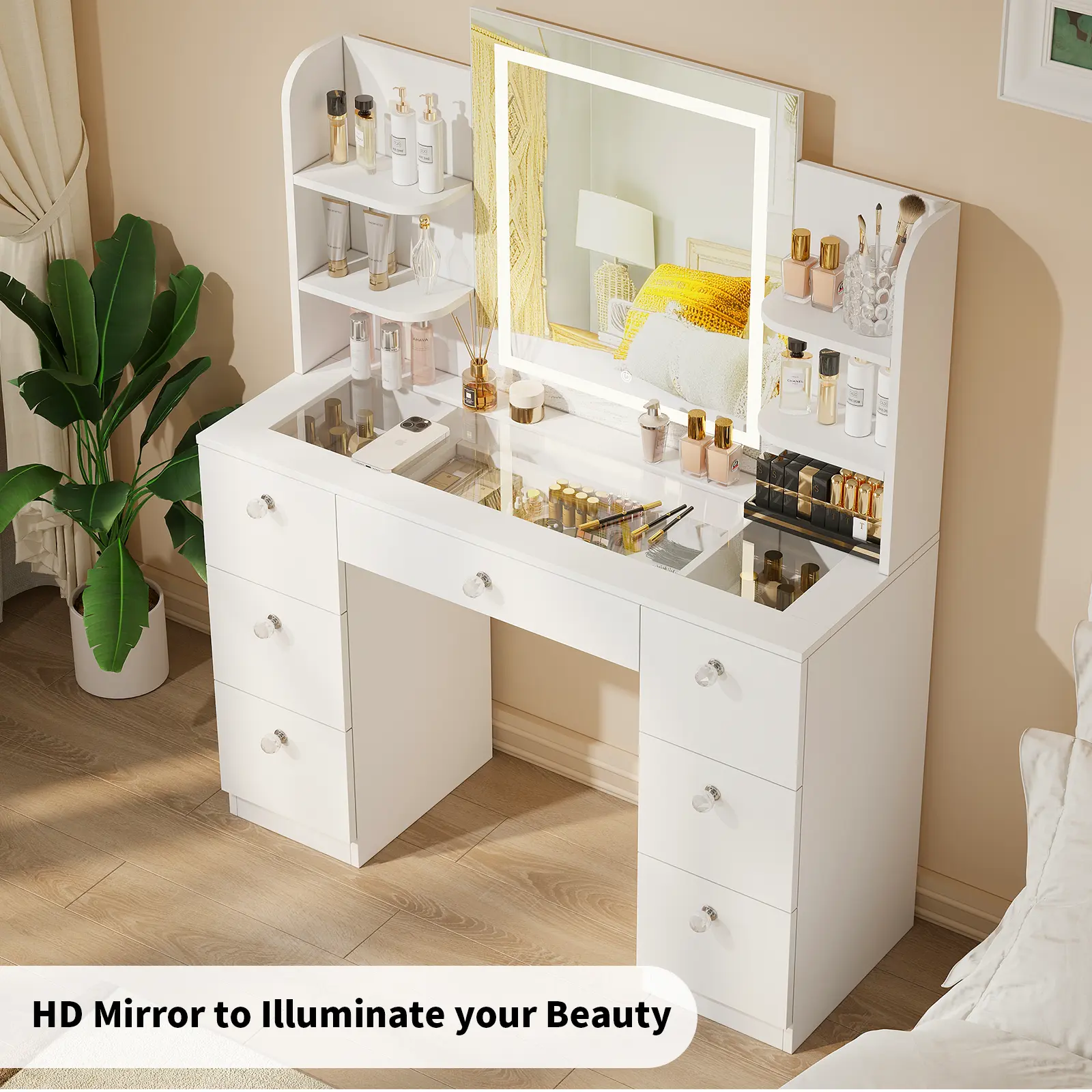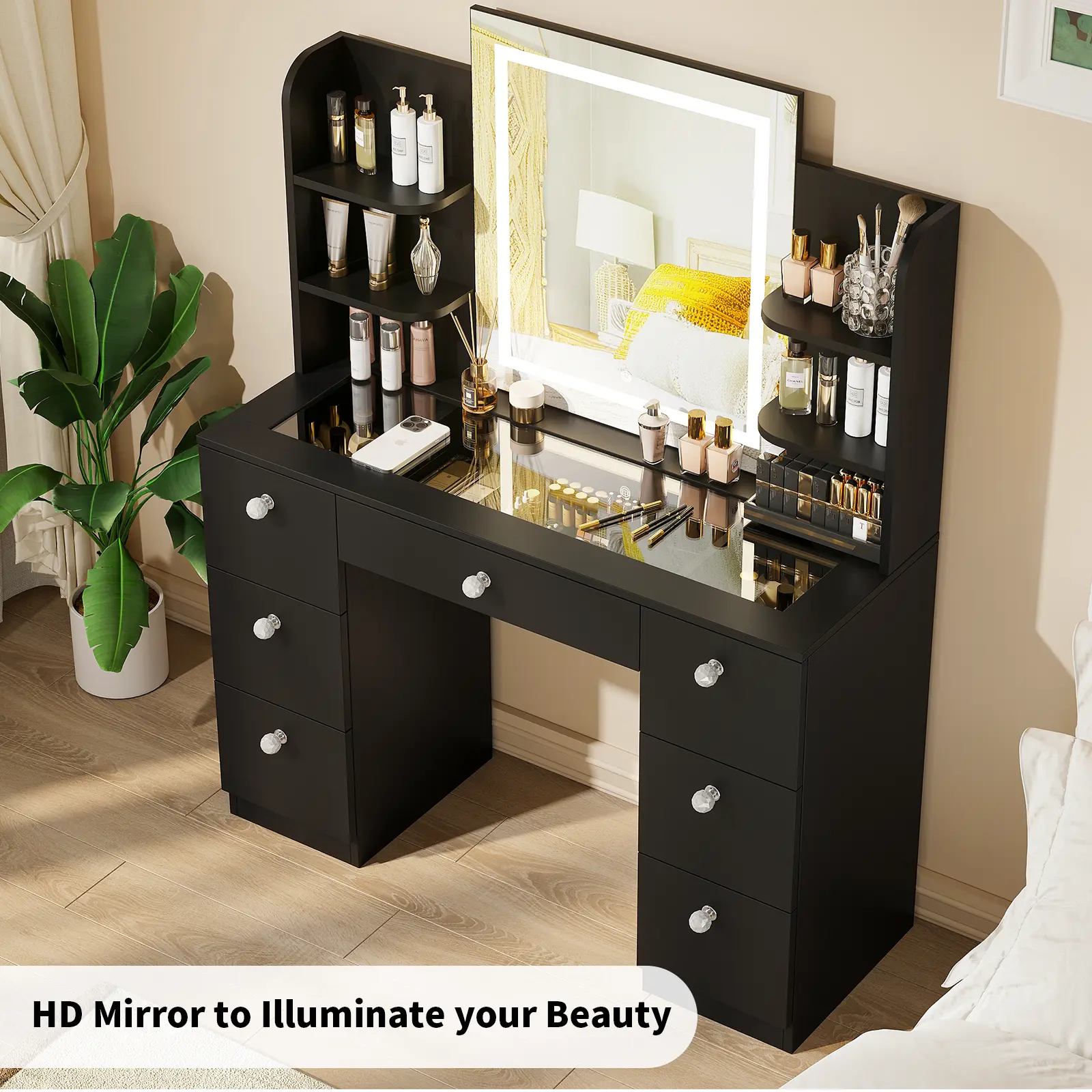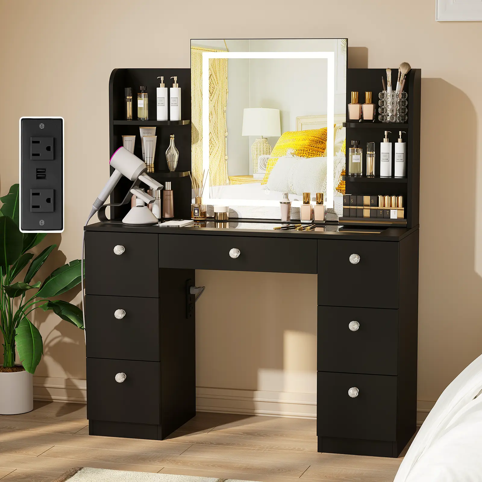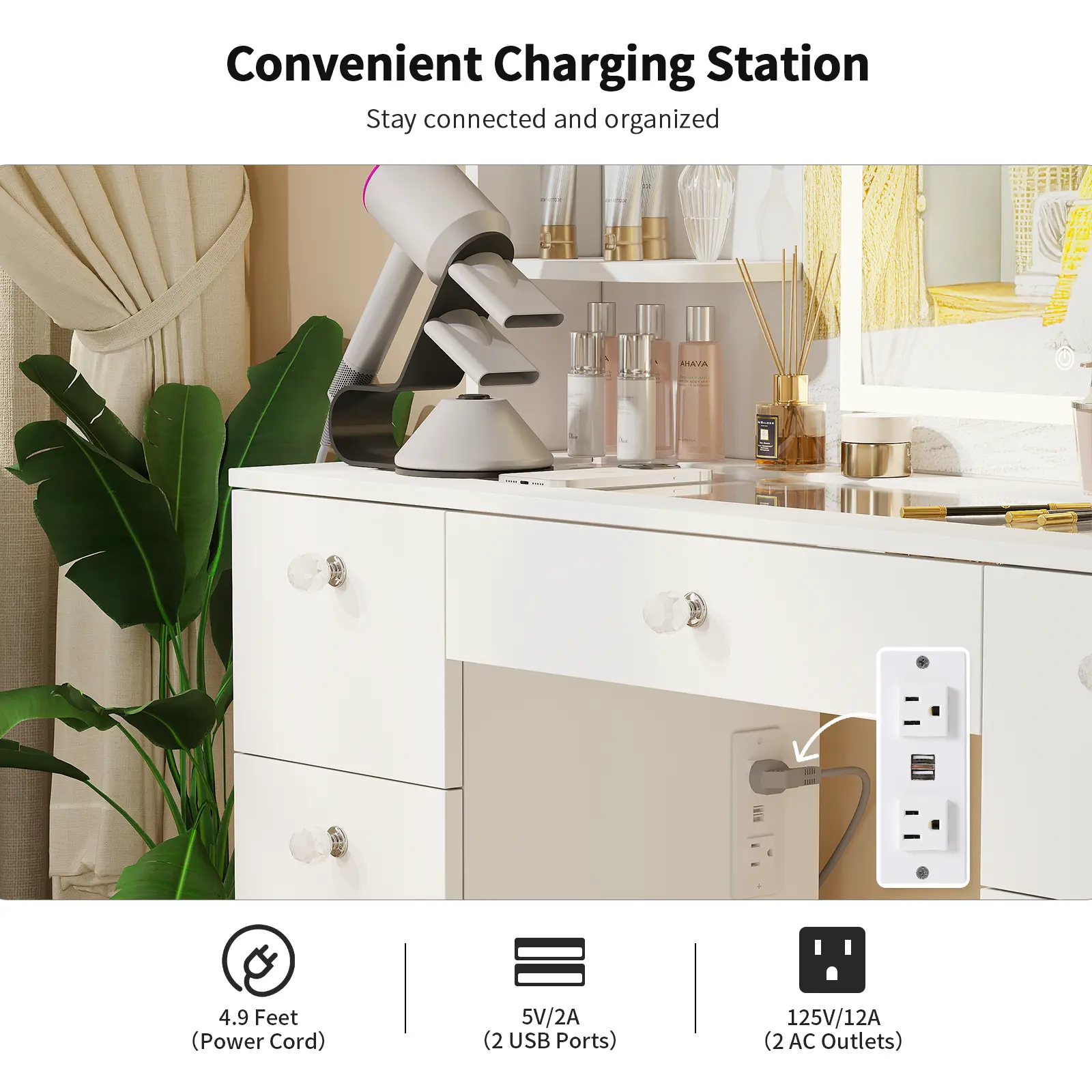 ◆CONVENIENT CHARGING STATION:Simplify your beauty routine with 2 standard plug outlets and 2 USB ports. Easily charge your hair dryer, curling iron, beauty device and cell phone and keep them within reach while you get ready.