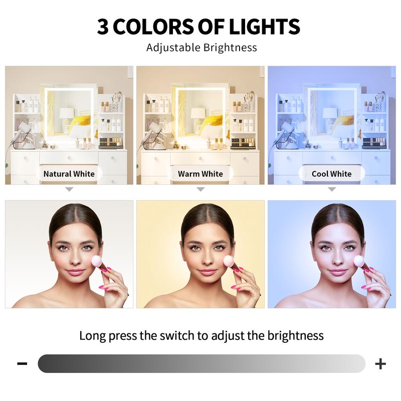 ◆PROFESSIONAL QUALITY LIGHTING:The built-in LED light with 3 color temperature modes,natural white, warm white and cool white.Long press the switch on the mirror to adjust the brightness and enhance your makeup routine. Enjoy precise and adjustable lighting for the perfect look.
