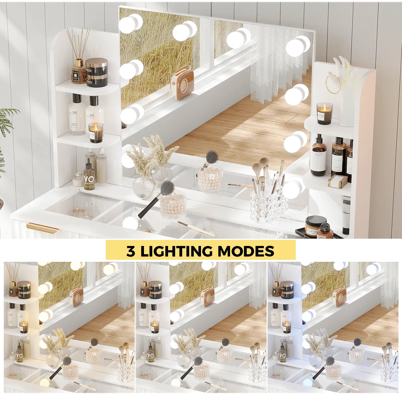 [3-Color Intelligent Lighting] The vanity's oversized mirror offers three lighting modes—warm yellow, warm white, and cool white—providing optimal illumination for makeup, skincare, and styling. Ideal for bedrooms, salons, or live-streaming setups. Tap to switch modes or long-press for stepless brightness adjustment.