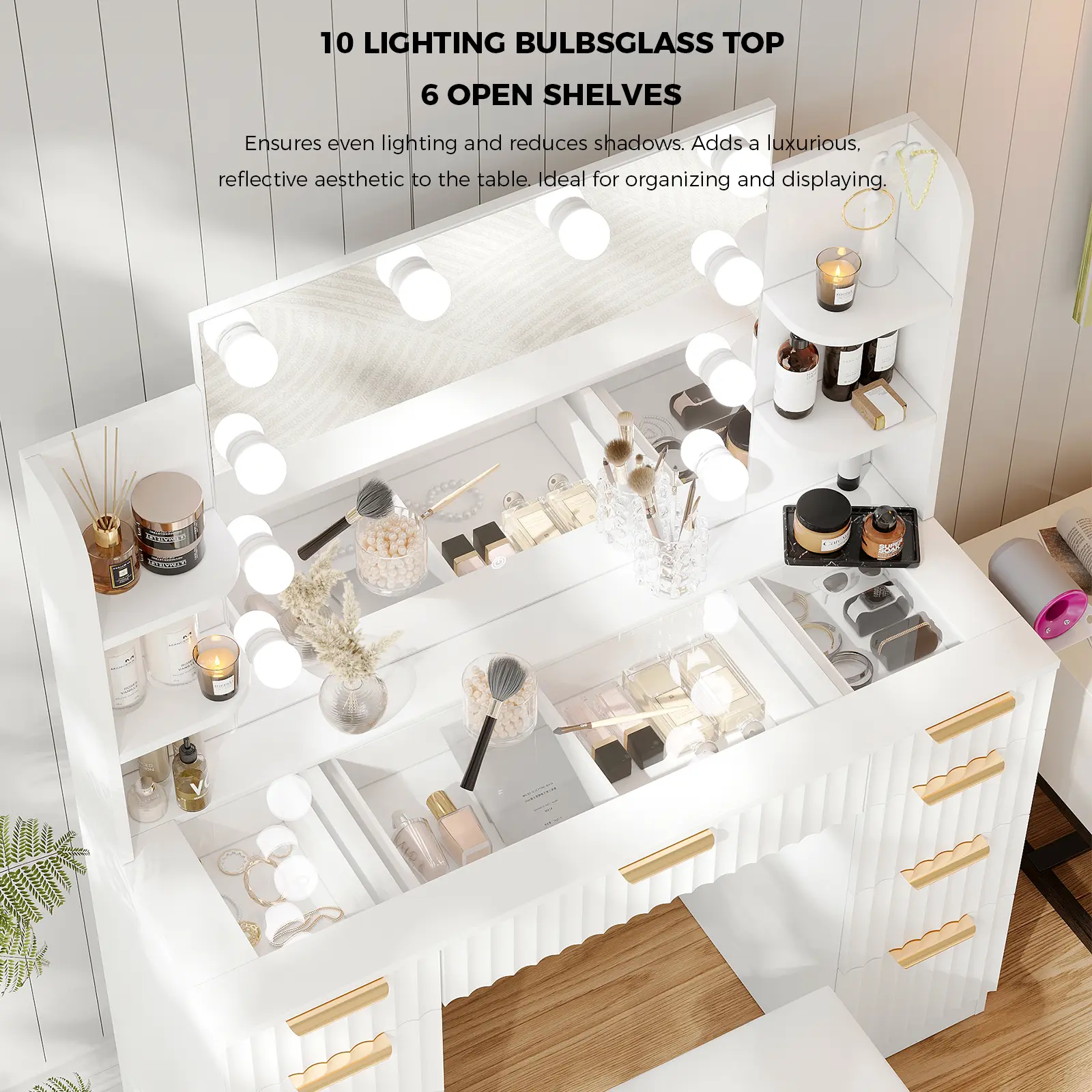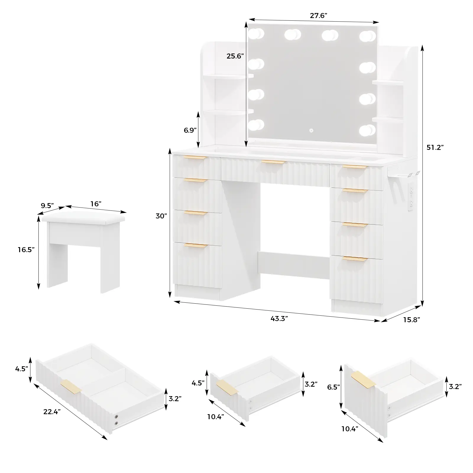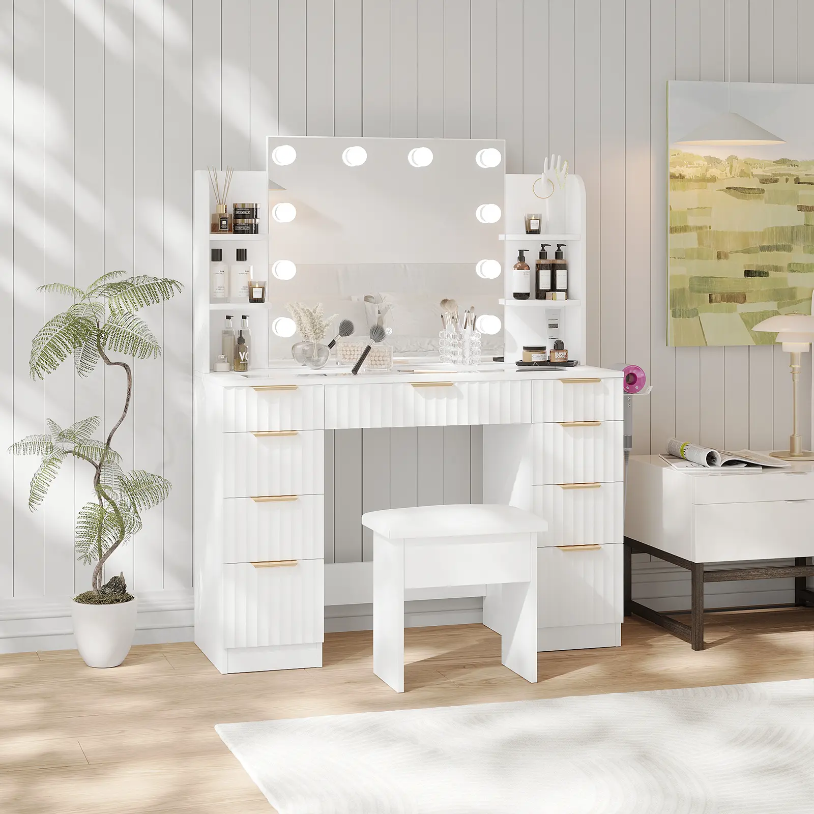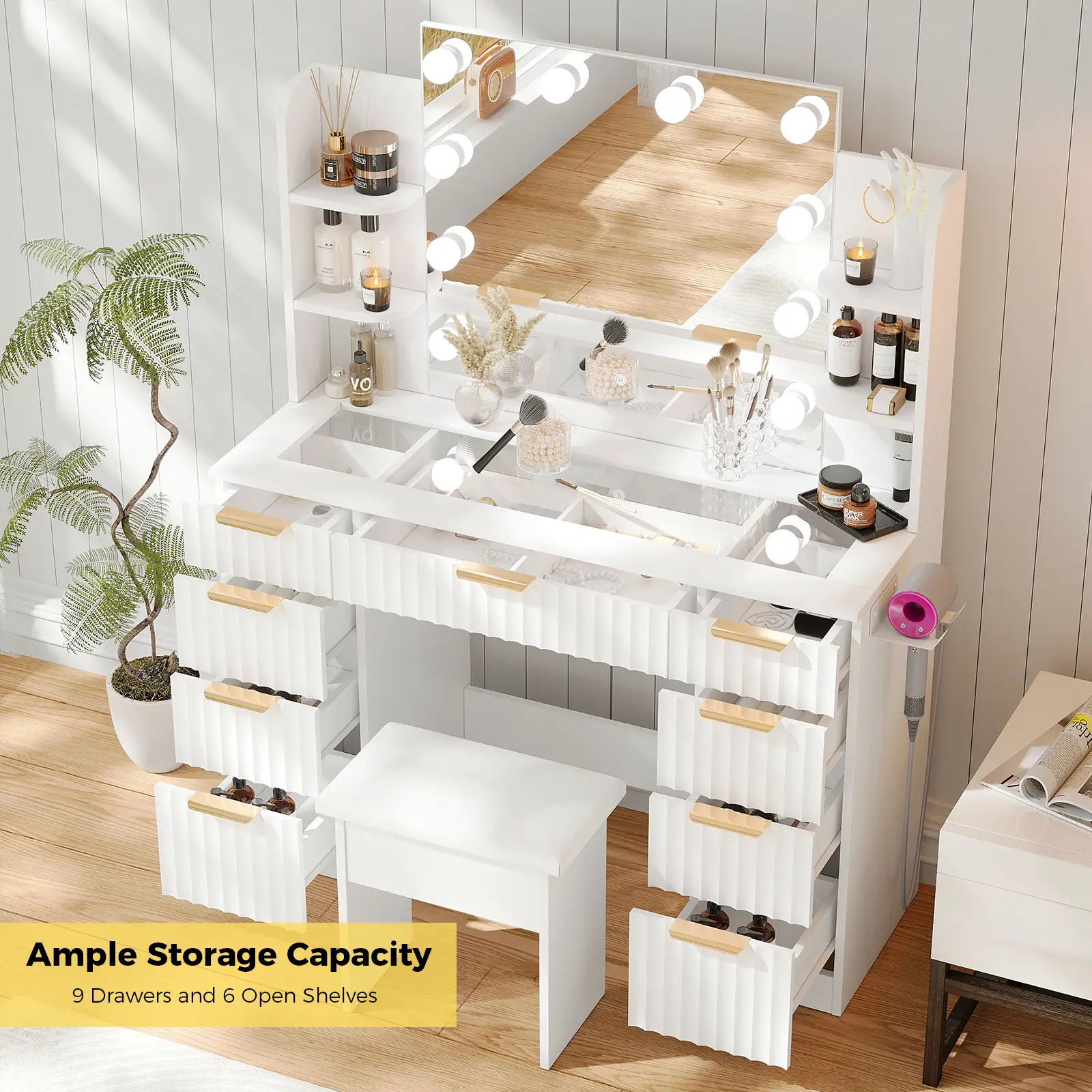 [Multifunctional Vanity with USB/Outlet] Equipped with a built-in charging station—1 standard power outlet and 2 USB ports—this vanity allows you to conveniently use hair dryers, curling irons, and simultaneously charge phones or tablets. Enjoy seamless multitasking, whether doing makeup or watching shows, with everything within easy reach.