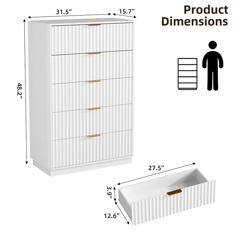 ·Ample Storage Space: Maximize your home organization with this generously sized dresser. It features five deep, smooth-gliding drawers equipped with silent guide rails, offering ample space to neatly store clothing, bedding, accessories, and more