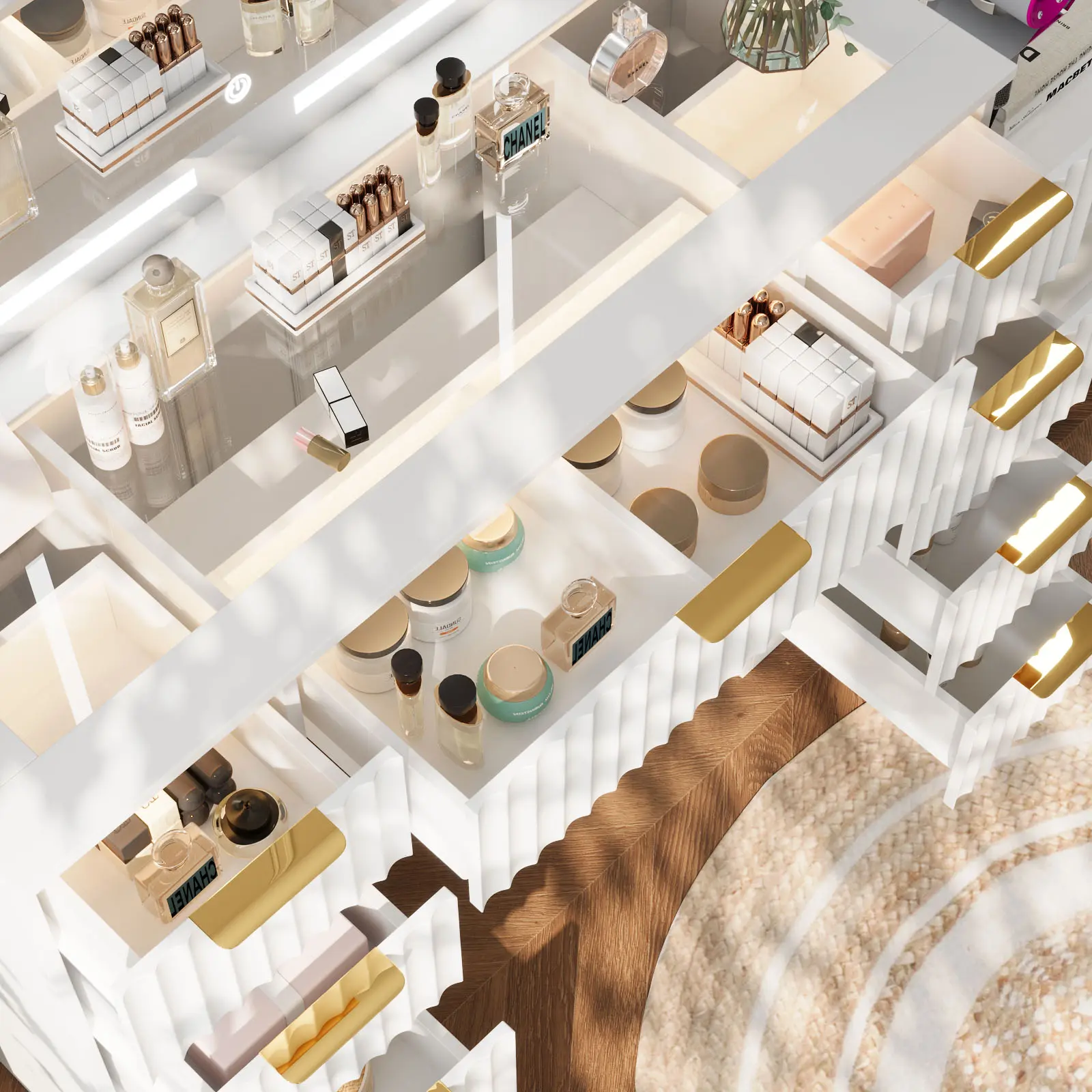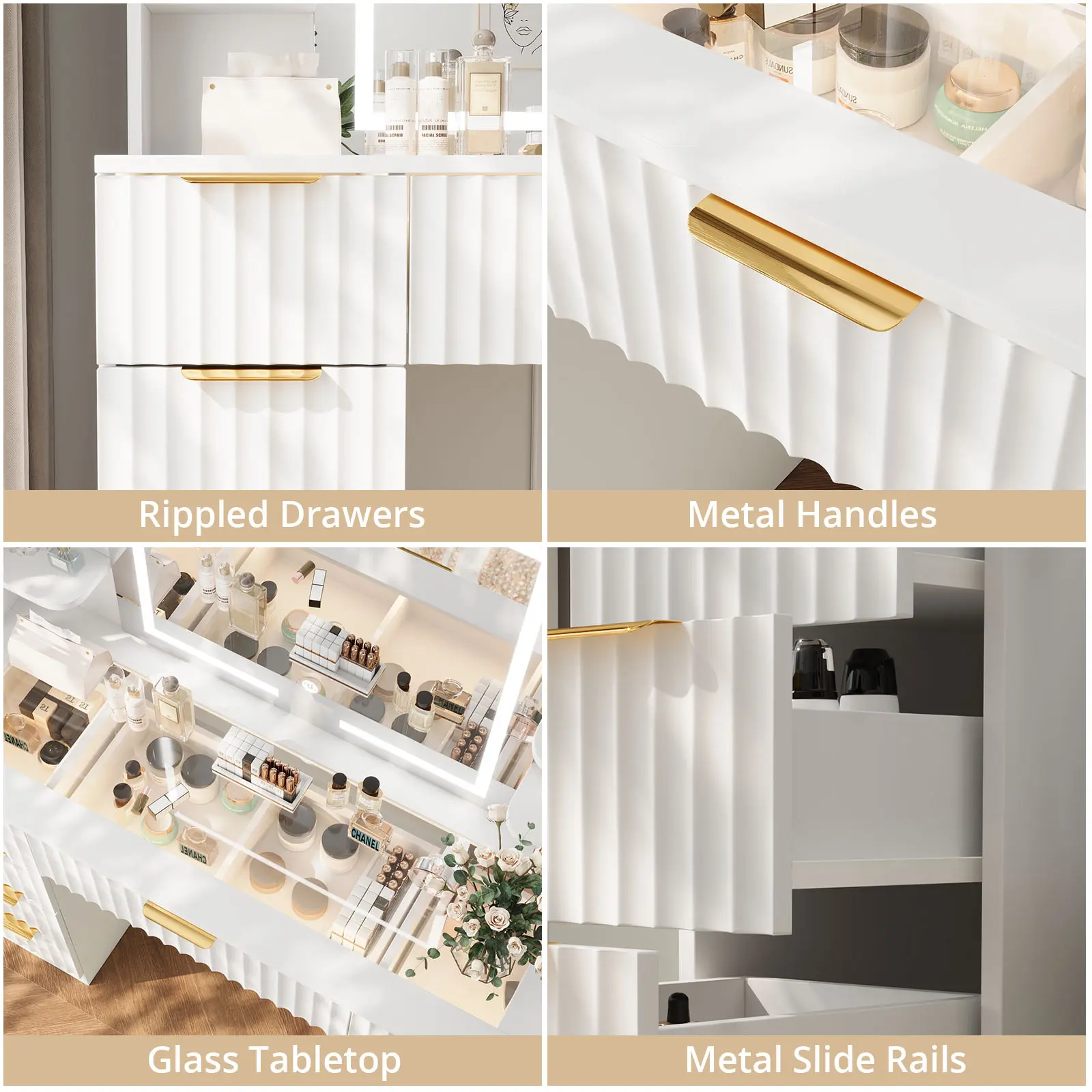 [Metal Slides & Handles] The white vanity is crafted from scratch-resistant, moisture-proof MDF board paired with durable metal handles. A simple wipe with a damp cloth keeps it looking fresh. The drawers feature silent ball-bearing slides for smooth gliding, ensuring neat and organized storage.