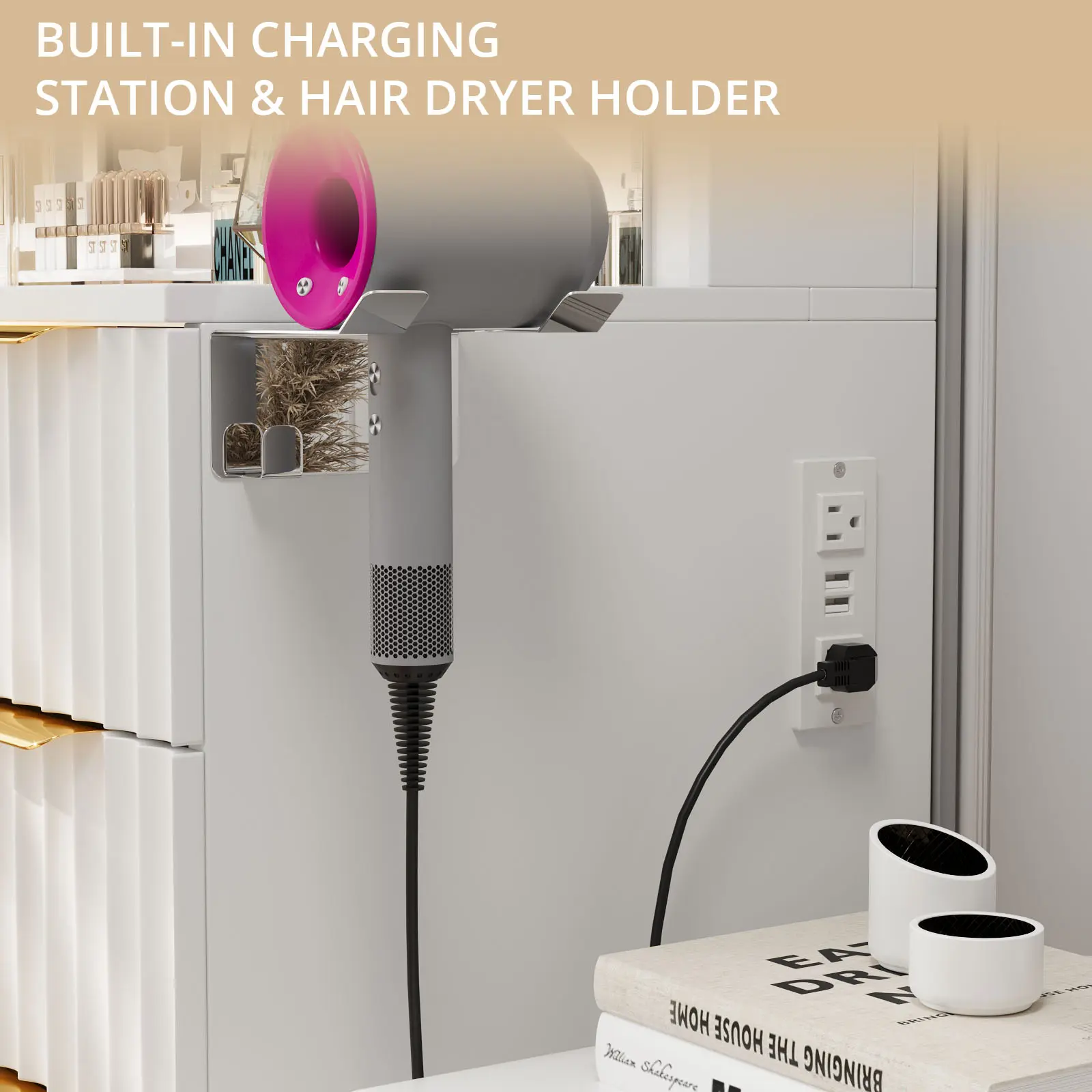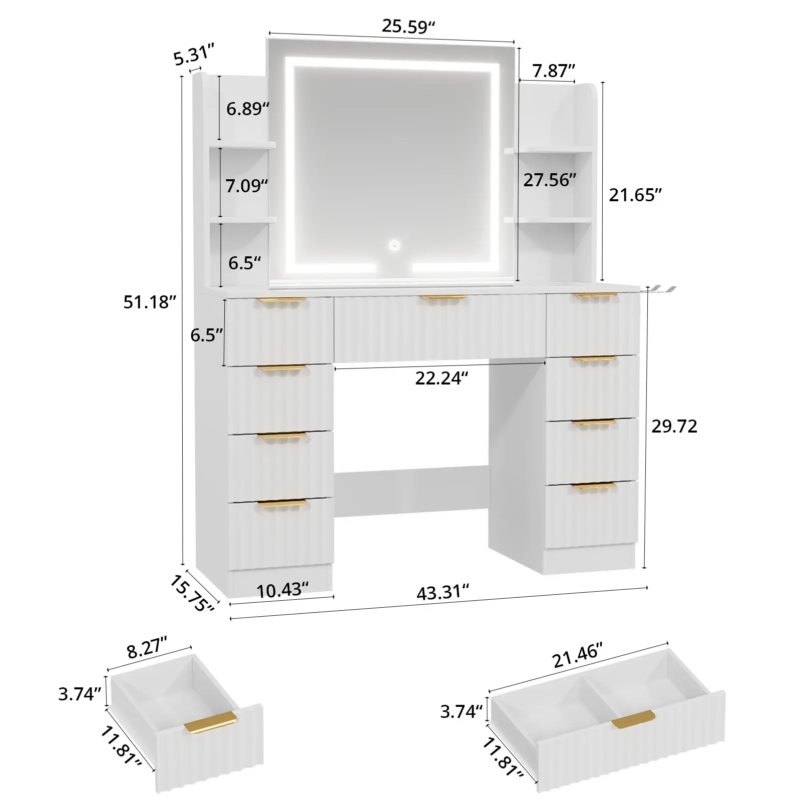 [Multifunctional Vanity with USB/Outlet] Equipped with a built-in charging station—1 standard power outlet and 2 USB ports—this vanity allows you to conveniently use hair dryers, curling irons, and simultaneously charge phones or tablets. Enjoy seamless multitasking, whether doing makeup or watching shows, with everything within easy reach.