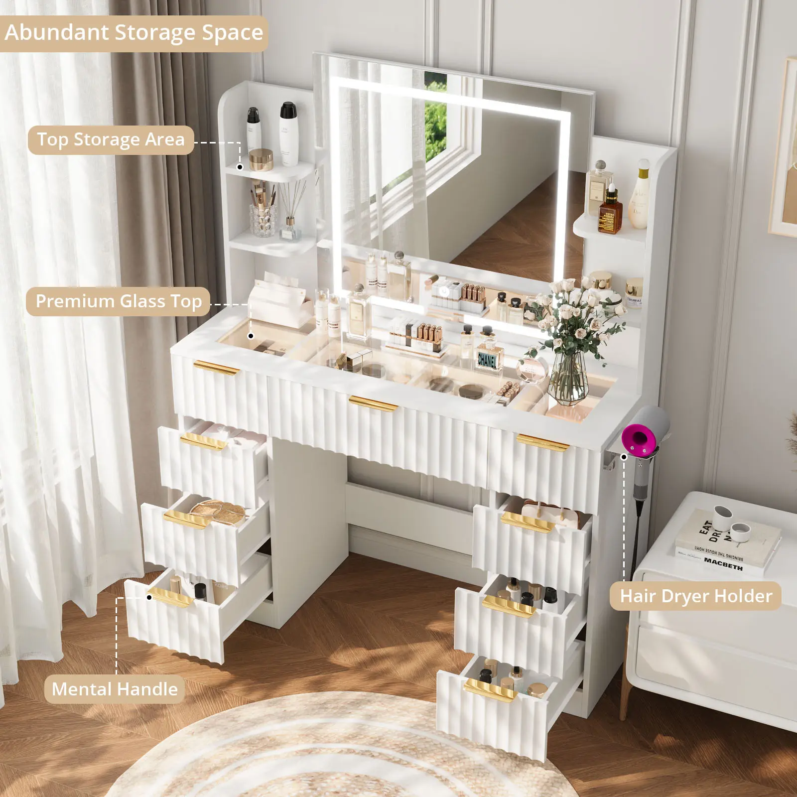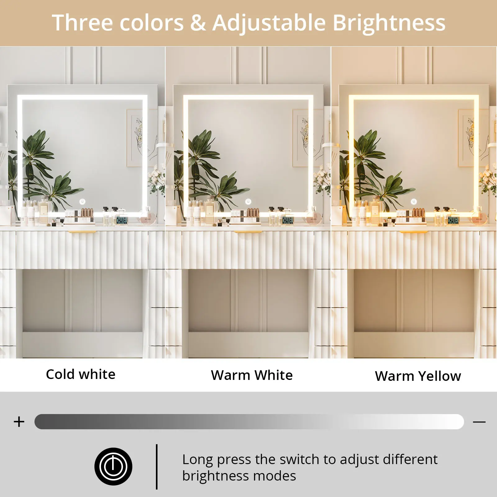 [3-Color Intelligent Lighting] The vanity's oversized mirror offers three lighting modes—warm yellow, warm white, and cool white—providing optimal illumination for makeup, skincare, and styling. Ideal for bedrooms, salons, or live-streaming setups. Tap to switch modes or long-press for stepless brightness adjustment.