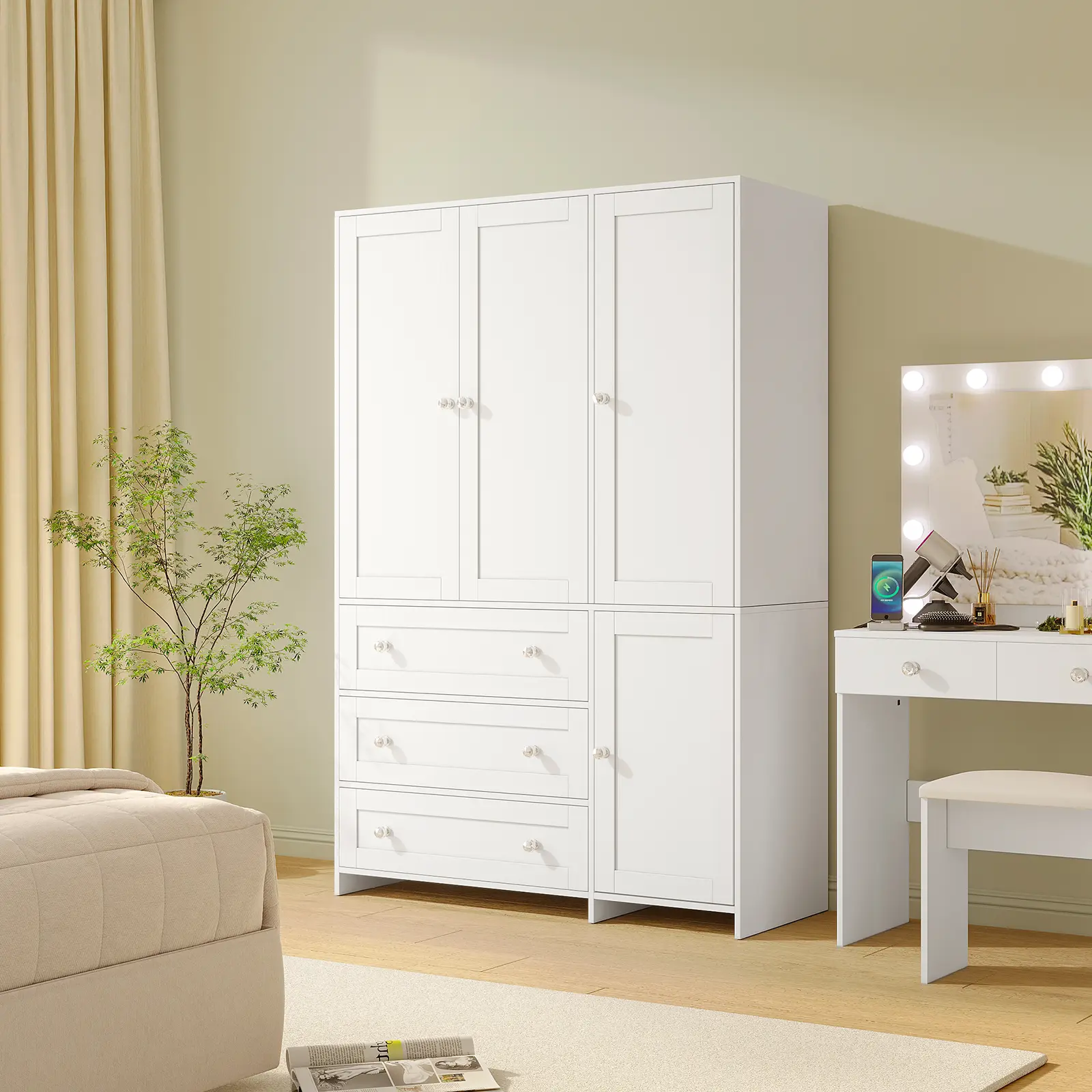 Maximize storage with a hanging area for suits/coats, 3-tier shelves for boxes/shoes, and a closed cabinet. 3 smooth drawers store socks/underwear, combining hanging and folding spaces seamlessly.