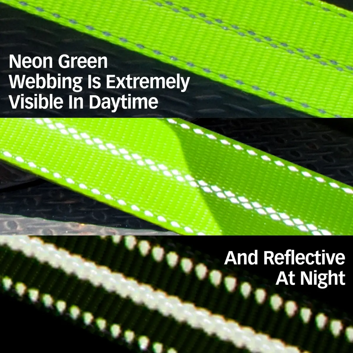 Neon green webbing is bright in the daylight and reflective at night