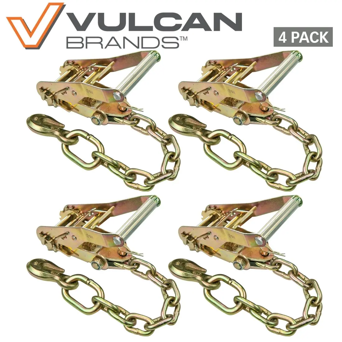 The VULCAN Ratchet Buckle is a set of 4 chain anchors that are designed to provide a secure connection to d-rings, side rails, chains or stake pockets. The product is made of Grade 70 Chain Anchor with Grab Hook, which is a strong and durable material that can withstand heavy loads. The wide steel handle provides a superior grip and comfort, making it easier to use the product even when wearing gloves.