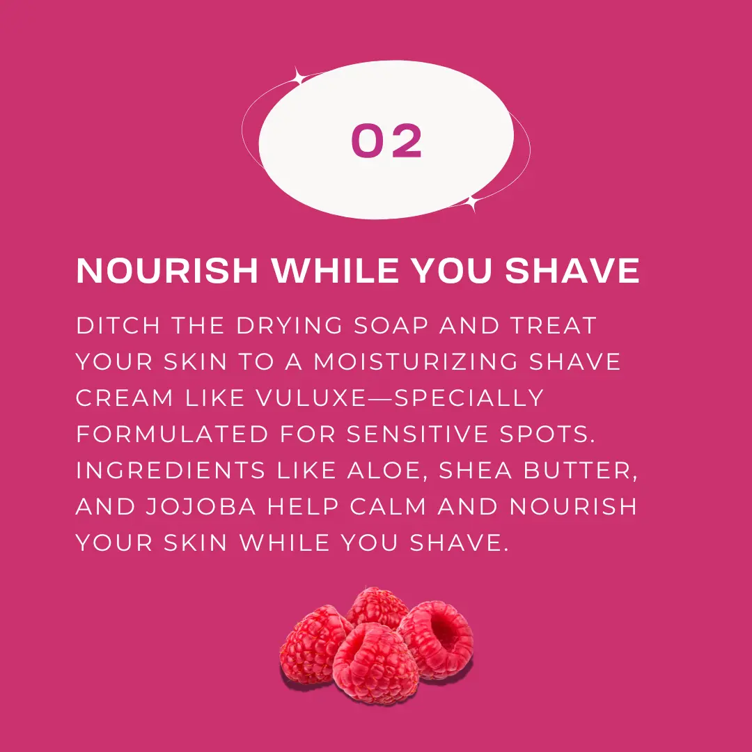 Ready for the best shave ever? Vuluxe Soothing Shave Cream is the shower essential you didn’t know you needed. This foaming formula helps prevent razor bumps and irritation with a powerful combination of ultra-hydrating and anti-inflammatory ingredients like shea butter, jojoba oil, aloe vera, and oat extract.