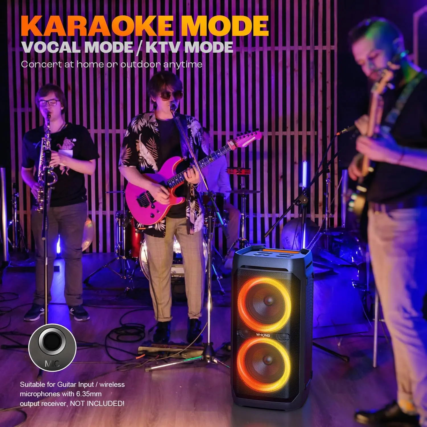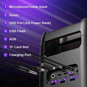 ·Mic and Guitar Input: T11 party portable speaker supports input of instruments with 6.35mm jack such as guitar/MIC (only dynamic microphone). It is also suitable for wireless MIC with a 6.35mm output receiver( NOT INCLUDED). Note: When using the this function, please press the ECHO “ -” button to adjust it to 0. T11 party outdoor speaker has its own MIC/GUITAR volume control and MIC ECHO adjustment buttons. you can adjust the vocals and timbre of the mic/guitar according to your own preferences