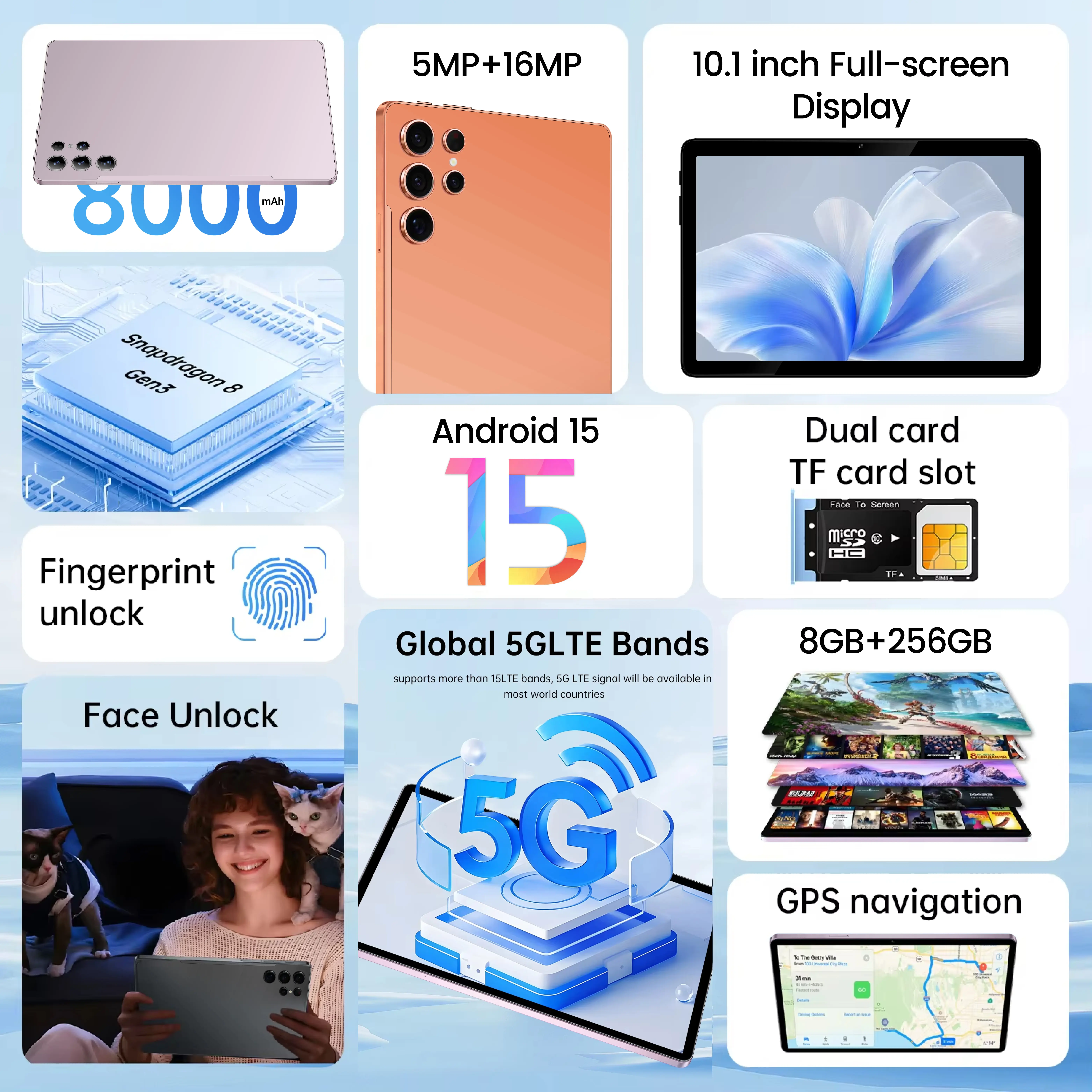 The W&O X9 is a 10.1" Android tablet equipped with 8GB RAM and 256GB storage. It features a 8000mAh battery for extended use. The tablet supports 5G WiFi for seamless connectivity. It comes with a 5+16MP camera for capturing clear photos and videos. Perfect for everyday use, this tablet offers a blend of performance and storage.