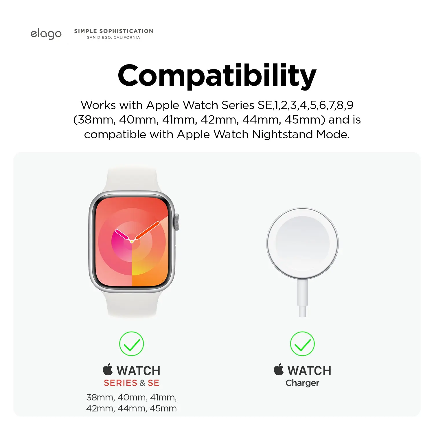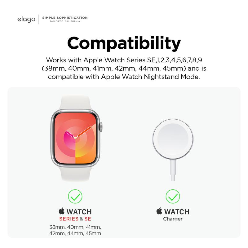 Compatible with all Apple Watch Series (9,8,SE2,7,6,SE,5,4,3,2,1) and compatible with Apple Watch Nightstand Mode. - Not compatible with Apple Watch Ultra