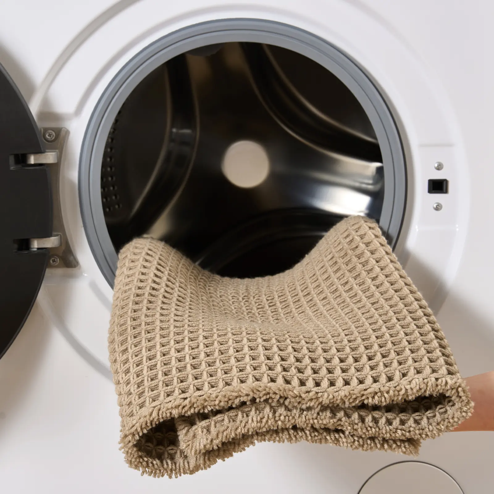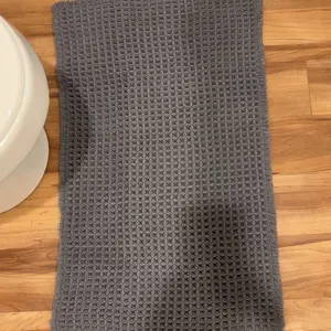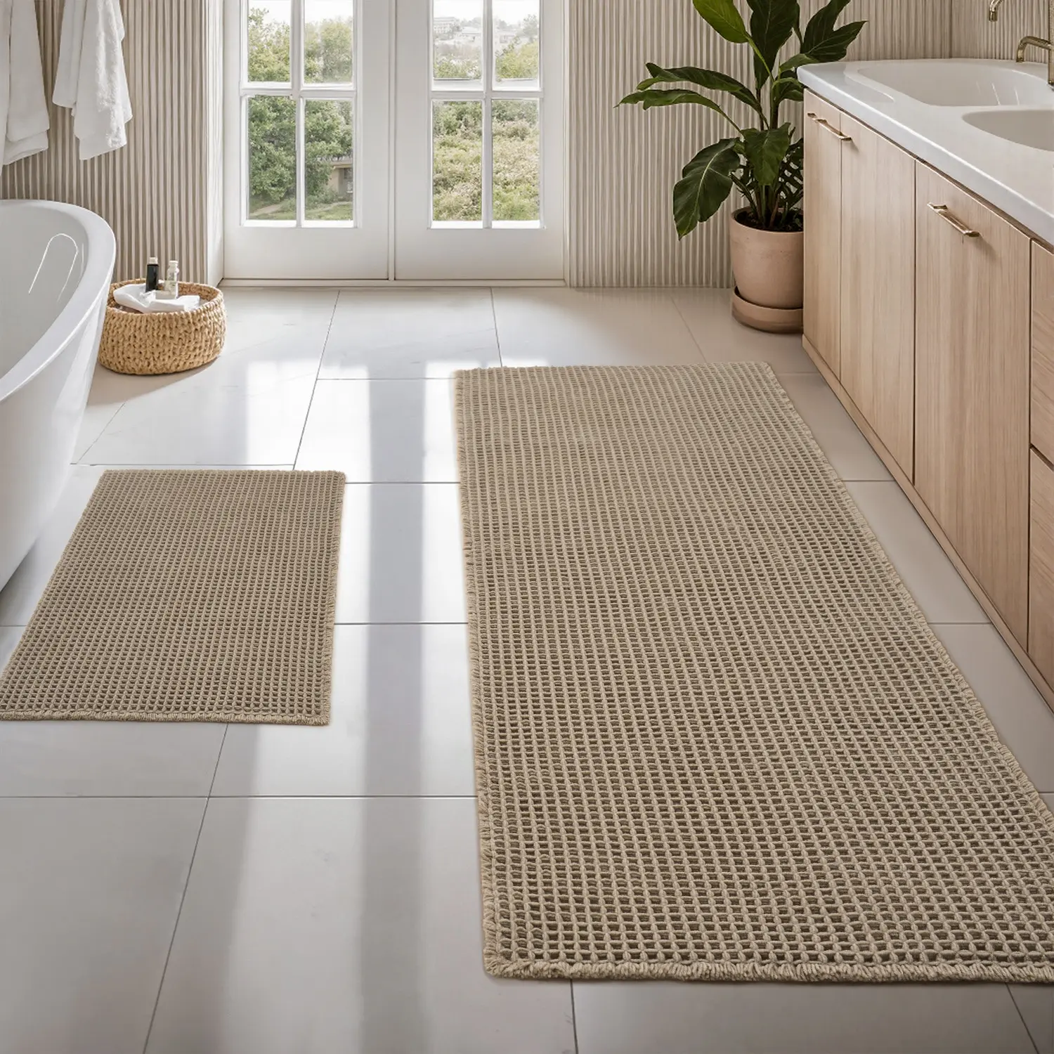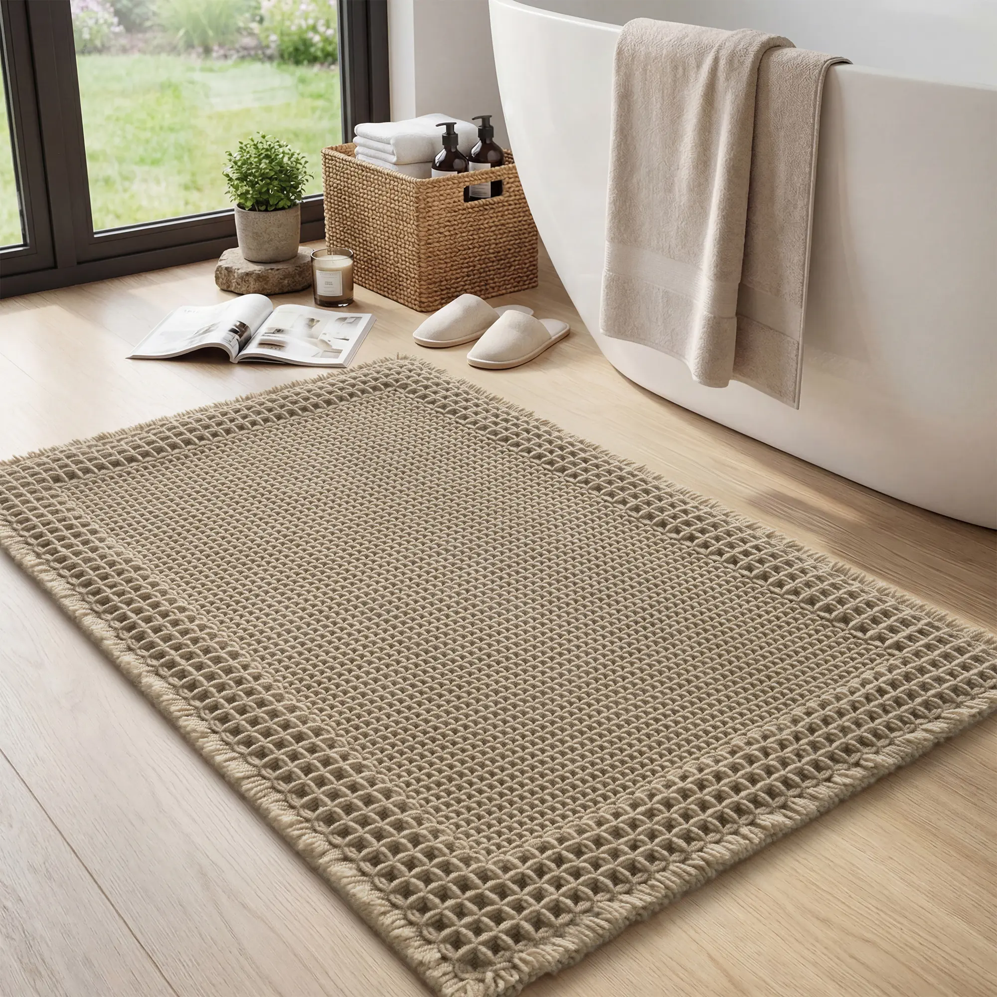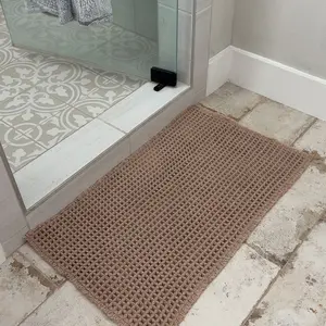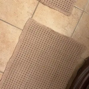These bath mats are everything!! The waffle material is so soft and comfortable under your feet. It’s non slip and soaks up water very well!