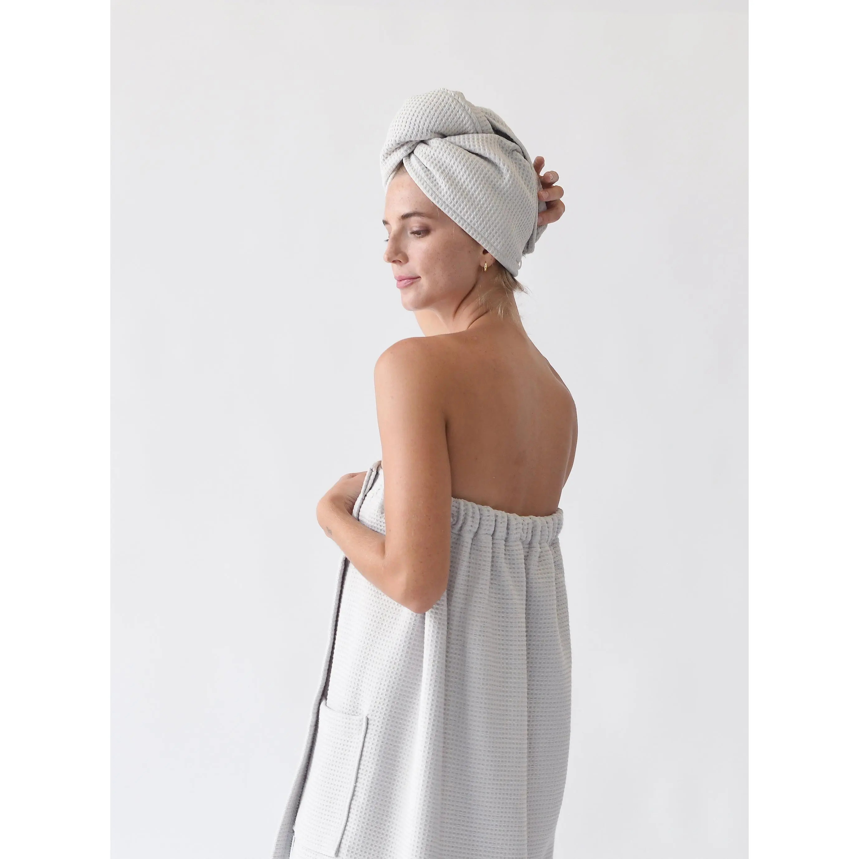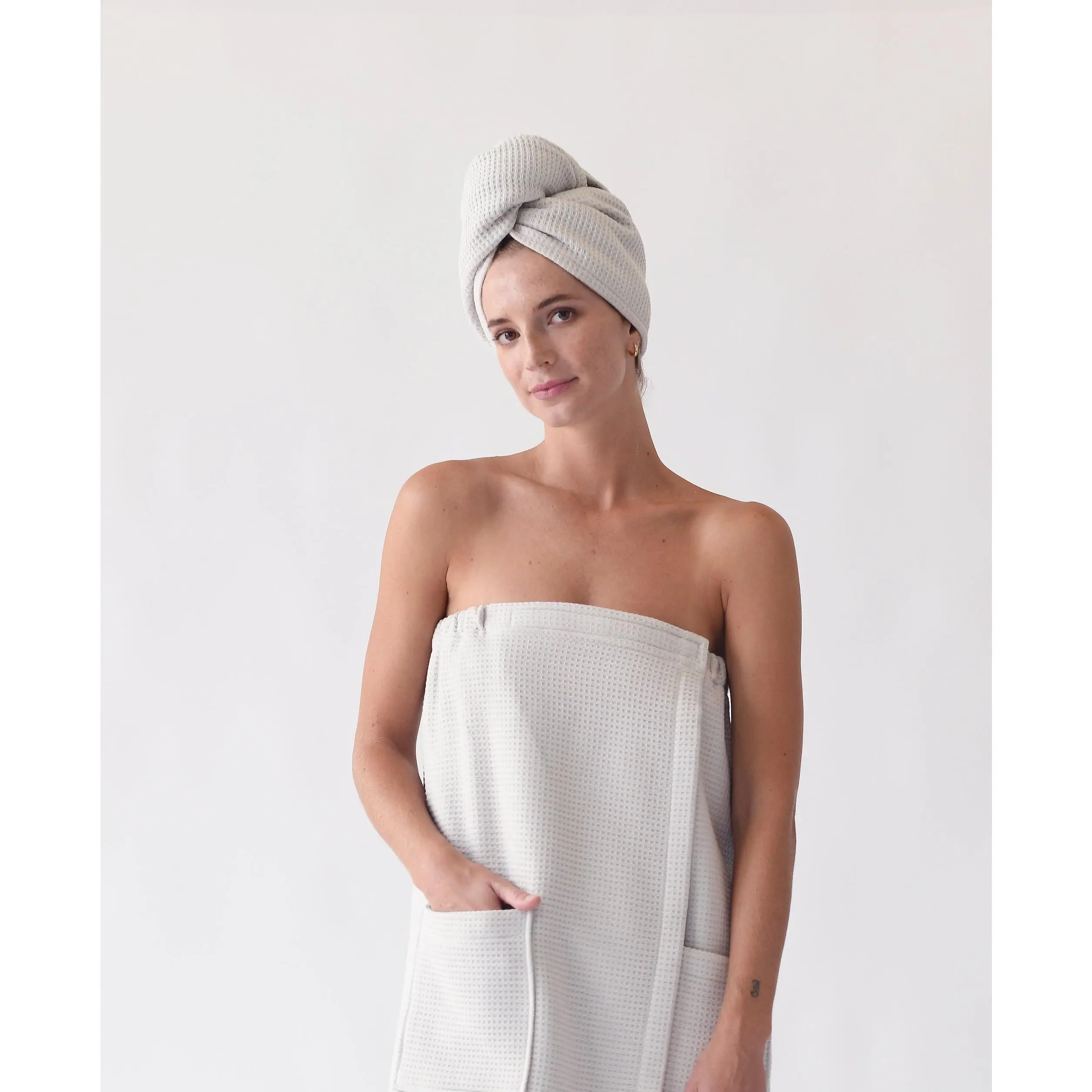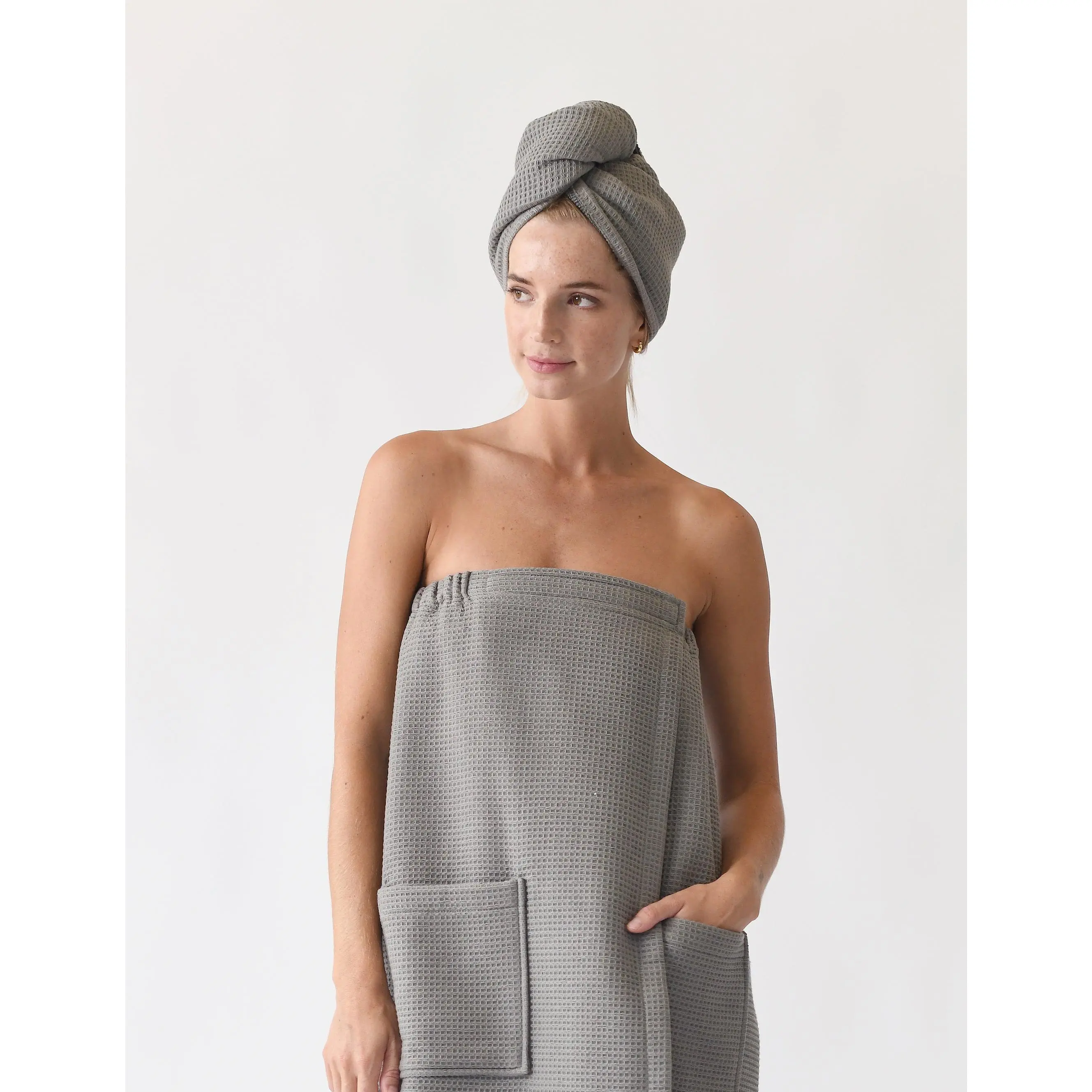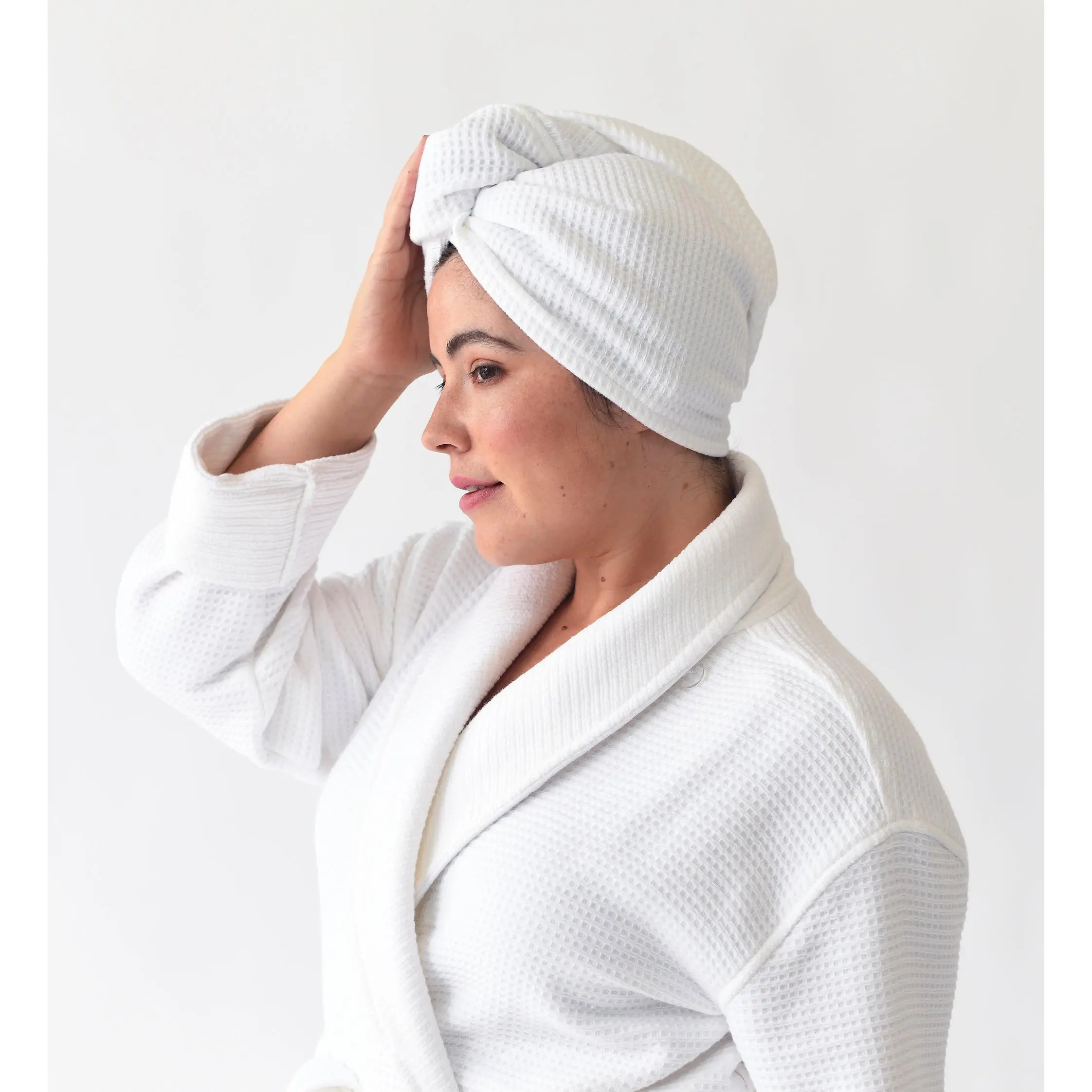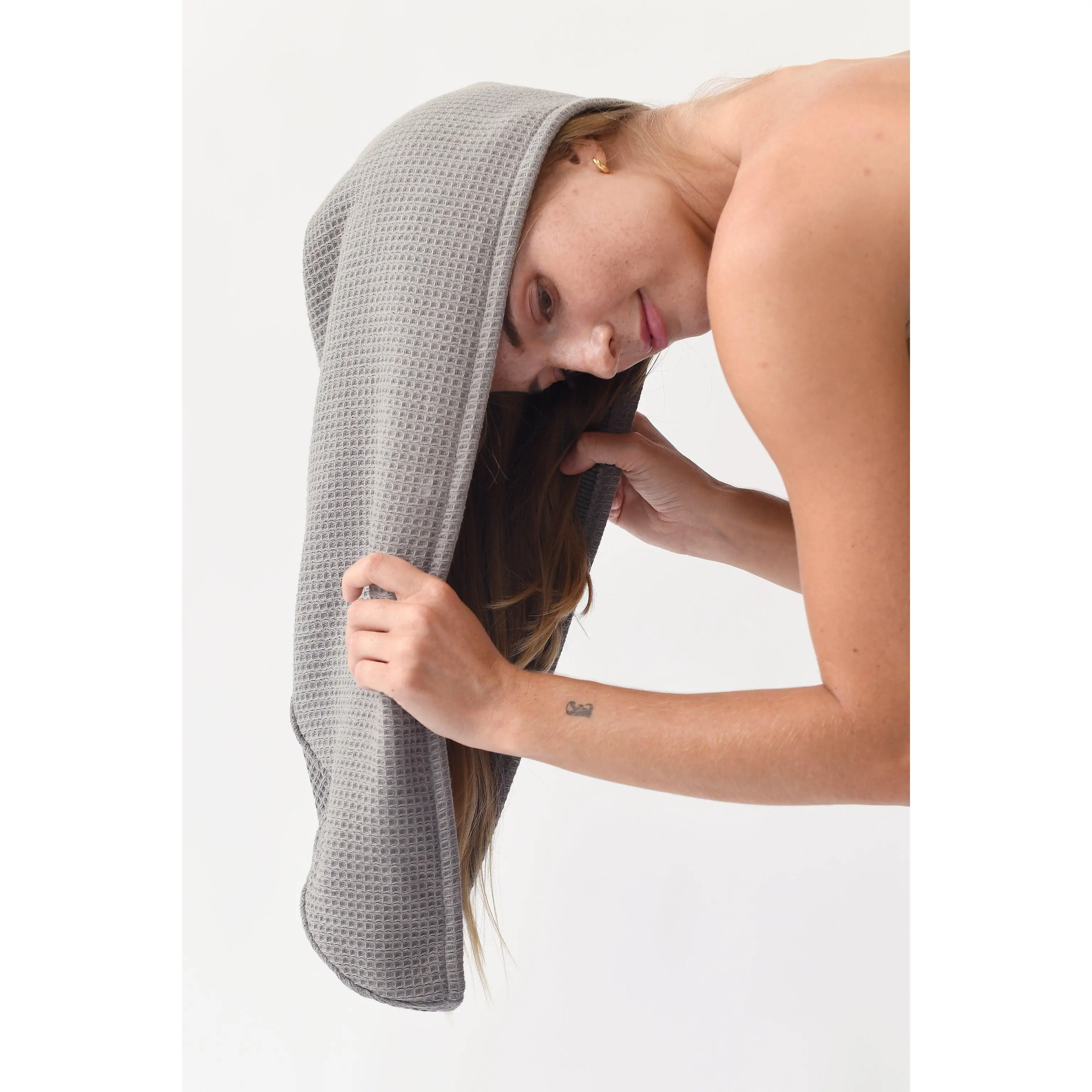I have the waffle bath towels and love the quality. I recently purchased the waffle hair wrap towel and love that also. The hair towel fits nicely and dries quickly.