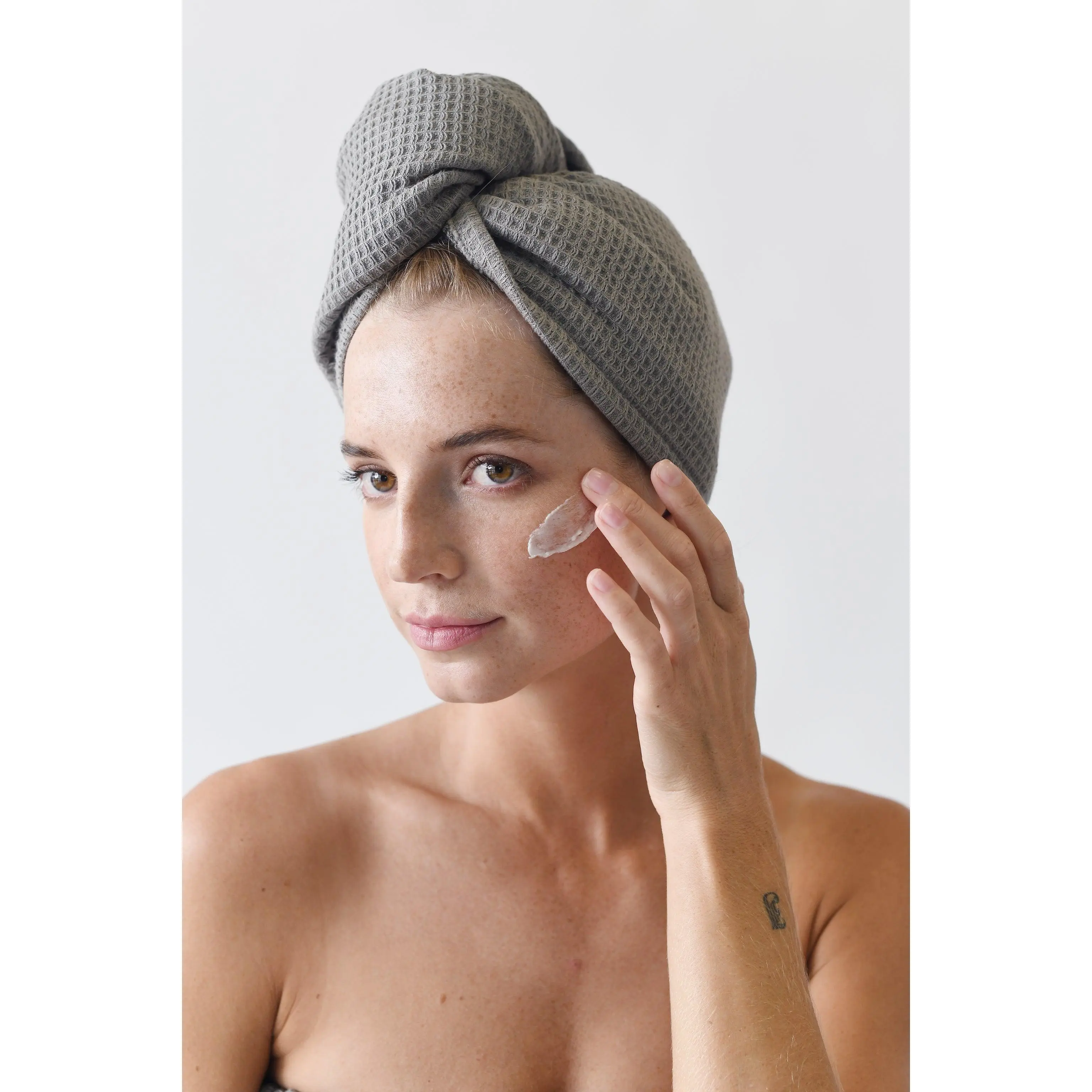 This waffle hair towel is soft, easy to use and absorbent. I have long hair and find that it holds all of my hair easily. I like using this towel after showering and when I use my face masks.