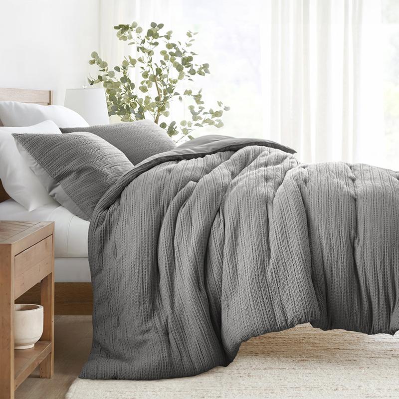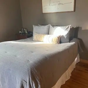 I waneted to update the guest bedroom with a new comforter and purchased this Waffle textured Down-Alternative Comforter Set. I have a queen bed, but wanted a comforter that was longer than a normal queen size, that would hang lower because the bed sits higher. Although I do not have king size pillows yet, I plan to get some because the shams are sized for king size pillows. I am so happy with the quality and how nice the comfortor looks! It definitely is an improvement from what I had before!