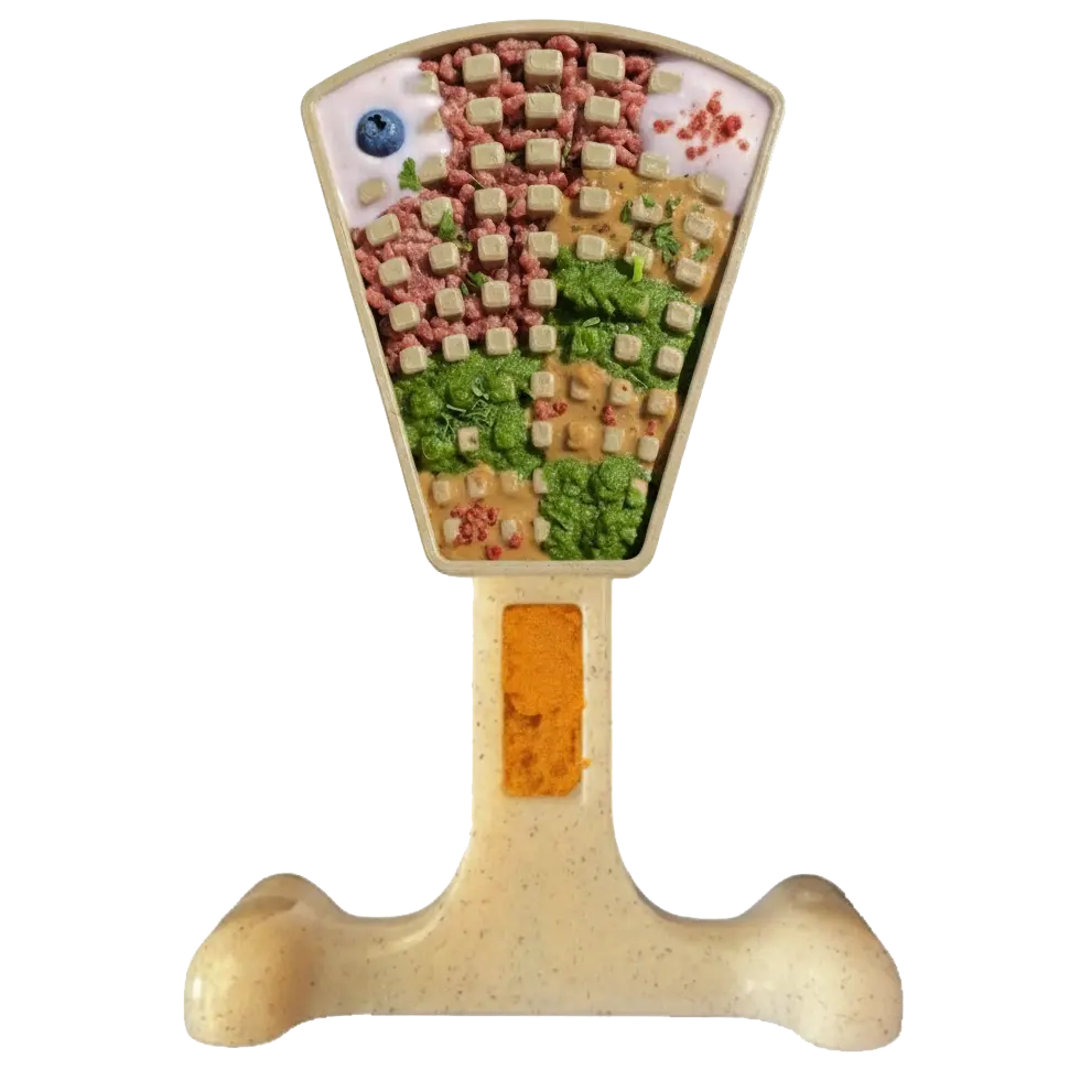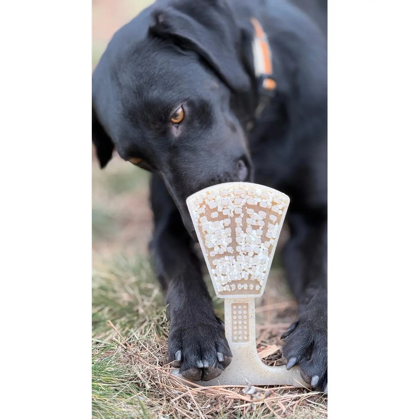 Use the Waffle Tower as a traditional chew toy for supervised chewing sessions, or spread peanut butter, yogurt, or other dog-safe spreads into the textured grooves for enrichment licking. The waffle pattern creates perfect pockets for holding treats while the durable nylon withstands chewing. For extended enrichment, freeze the toy with spreads inside. Always supervise your dog during use and remove the toy if it becomes damaged.