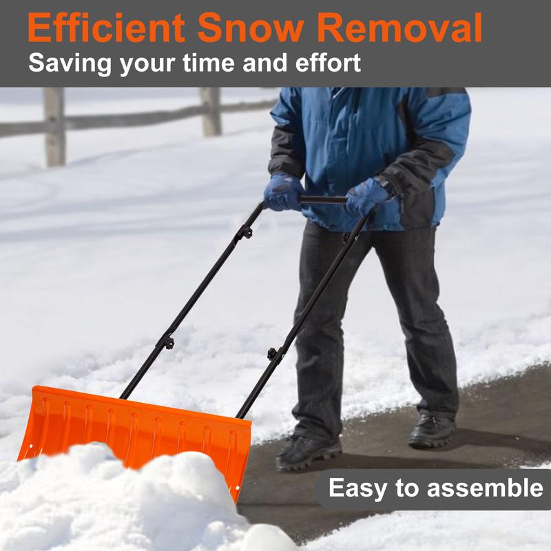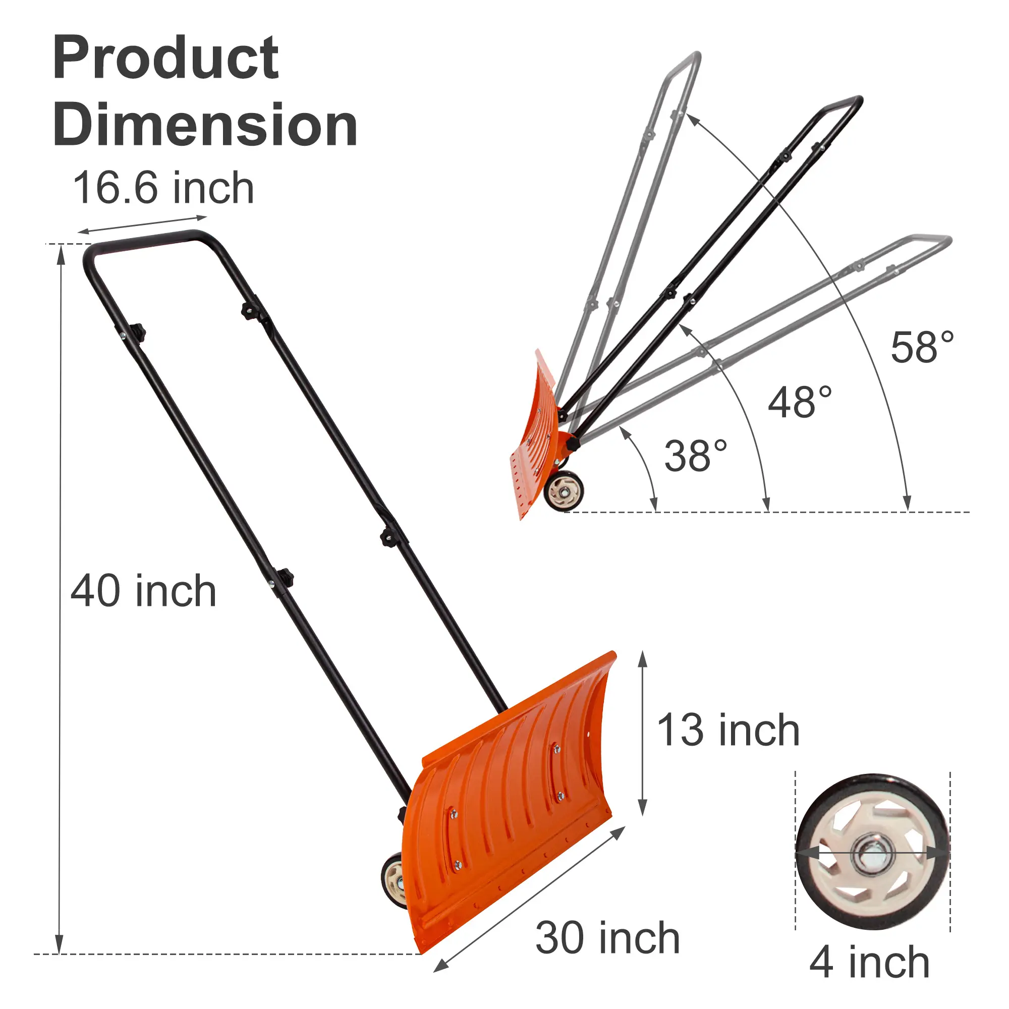 ·U-Shaped & Adjustable Handle: To make snow removal convenient and comfortable for people of different heights, our wheeled metal snow shovel features a U-shaped two-handed power grip with an adjustable structure that can be set at 33.5/39.4/44.1in (85/100/112cm). Angled plow design make you sweep the most snow with the least effort, eliminate the need for bending or straining. Simply adjust the handle to a comfortable upright position and effortlessly use the blade for continuous snow removal.