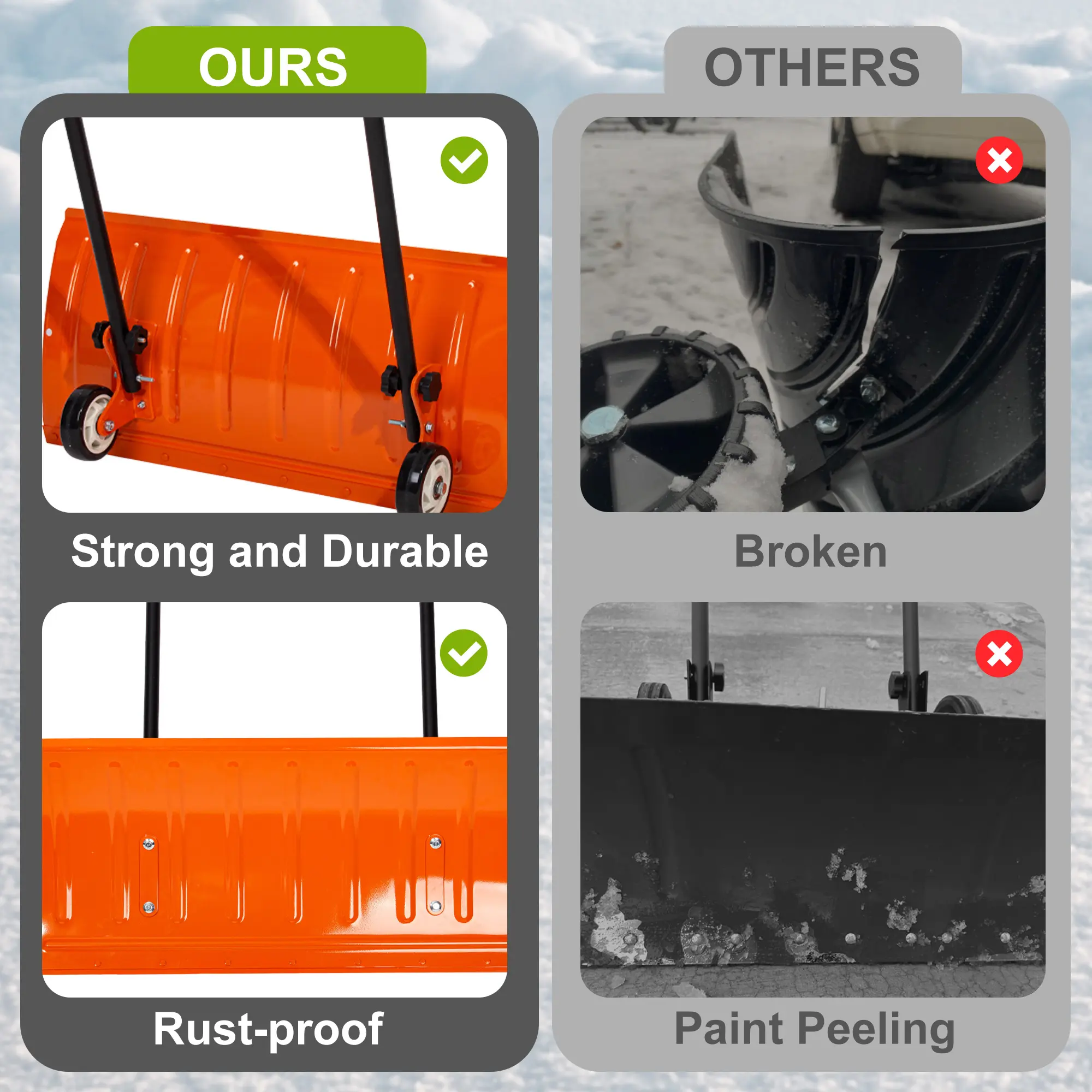 ·All metal & Robust: Contrary to conventional snow shovels prone to breakage, this wheeled metal snow pusher is durable. Featuring reinforced construction, robust welded joints and plastic spray treatment, it's unbreakable and rustproof. Additionally, its wheeled configuration alleviates strain on your back and knees, significantly enhancing the efficiency of snow removal tasks. It can withstand heavy use and harsh weather conditions, ensuring reliable performance year after year.